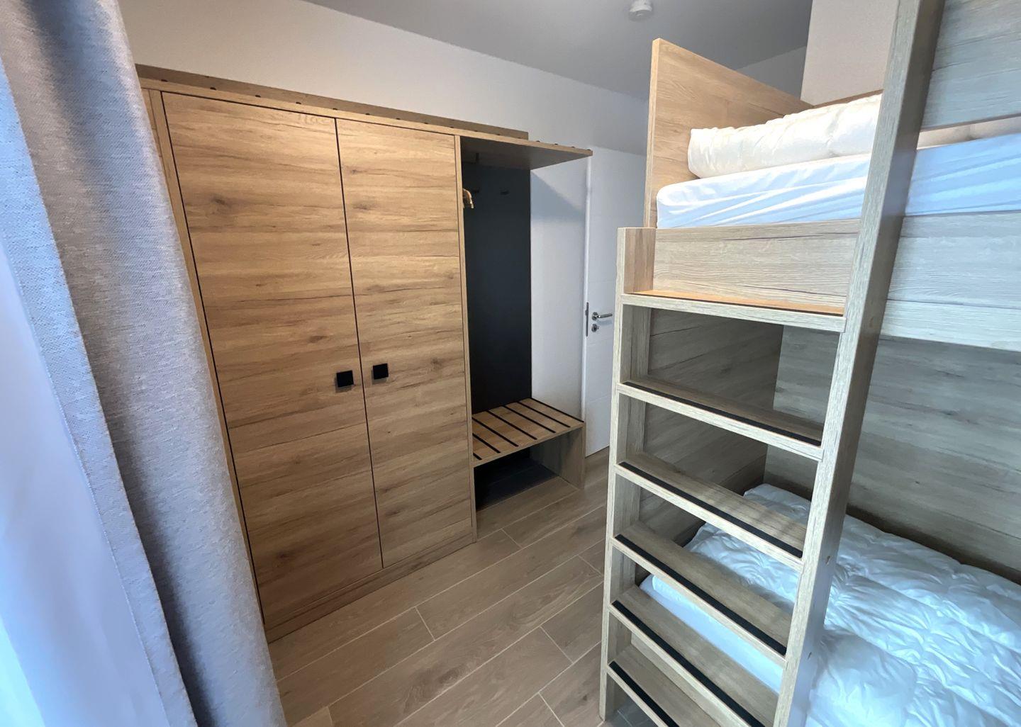 Schlafzimmer 2: Etagenbett (Maße: 2 x 90x200 cm), Flat-TV, Leselampen, Kleiderschrank, Verdunkelungsvorhänge