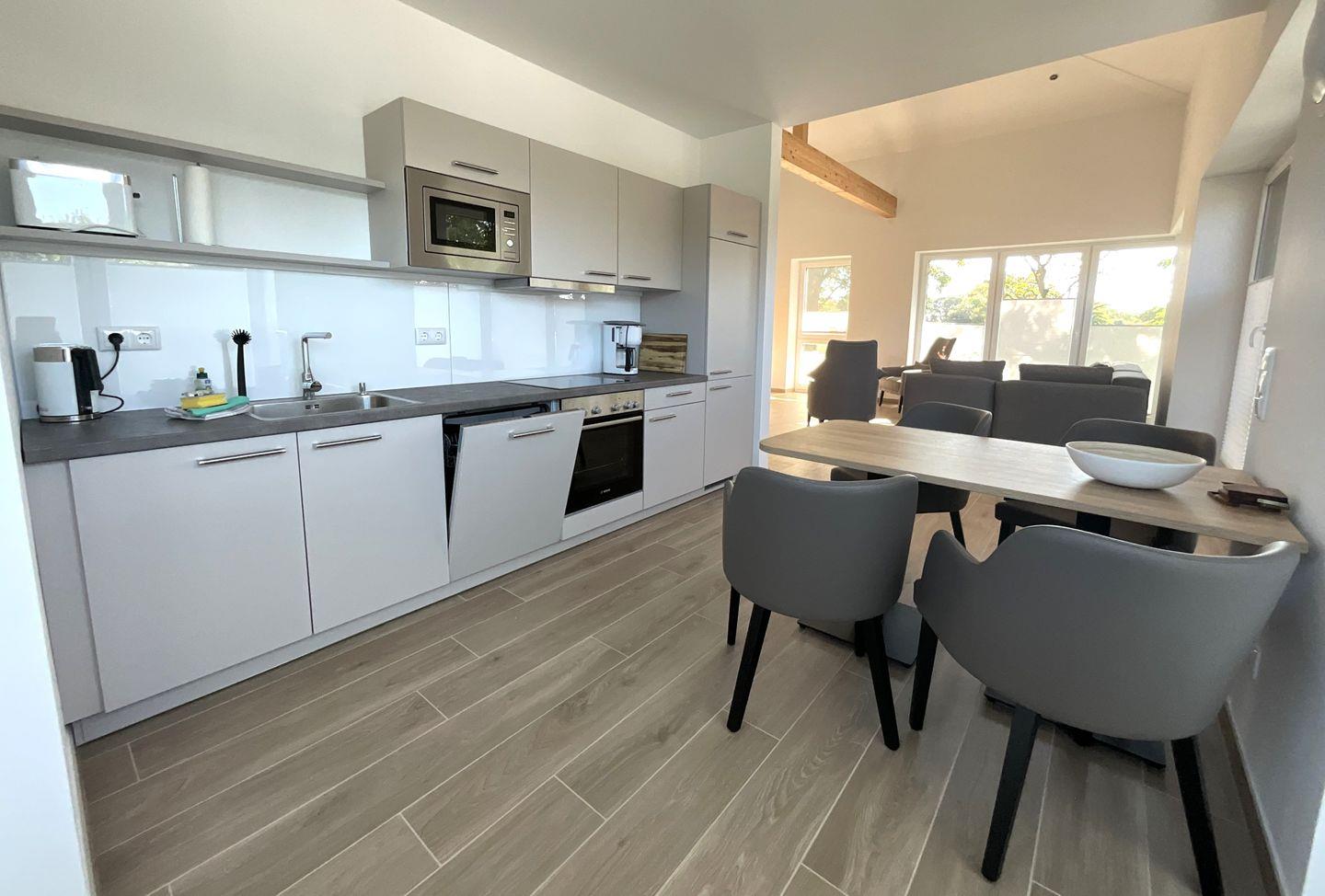 Die offen zum Wohnzimmer gestaltete Küche ist modern ausgestattet und ermöglicht gemeinsames Kochen und Genießen. Sie finden hier einen Ceranherd, Backofen, Kühlschrank mit Gefrierfach, Spülmaschine, Mikrowelle, Wasserkocher, Toaster sowie eine Kaffeemaschine und sämtliche Küchenutensilien, Geschirr und Besteck. Der angrenzende Essbereich mit Esstisch lädt zu geselligen Mahlzeiten ein, während in der Sofaecke mit bequemer Sitzgelegenheit mit Fernseher für abwechslungsreiche Unterhaltung sorgen. Die gesamte Wohnung ist mit Fliesenböden ausgestattet, was nicht nur für einen eleganten Stil, sondern auch für angenehme Fußbodenheizung sorgt.