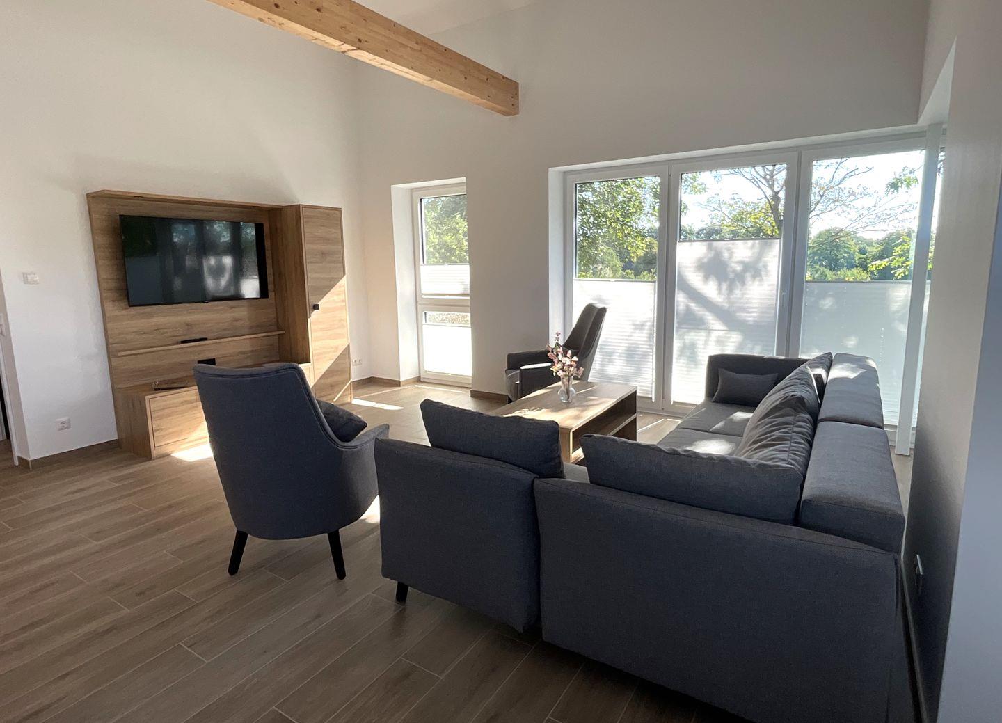 Wohnzimmer: gemütliche Sitzecke mit Sessel, Sofa, Flachbildfernseher, Empfang deutschsprachiger TV-Programme (SAT-Anlage),