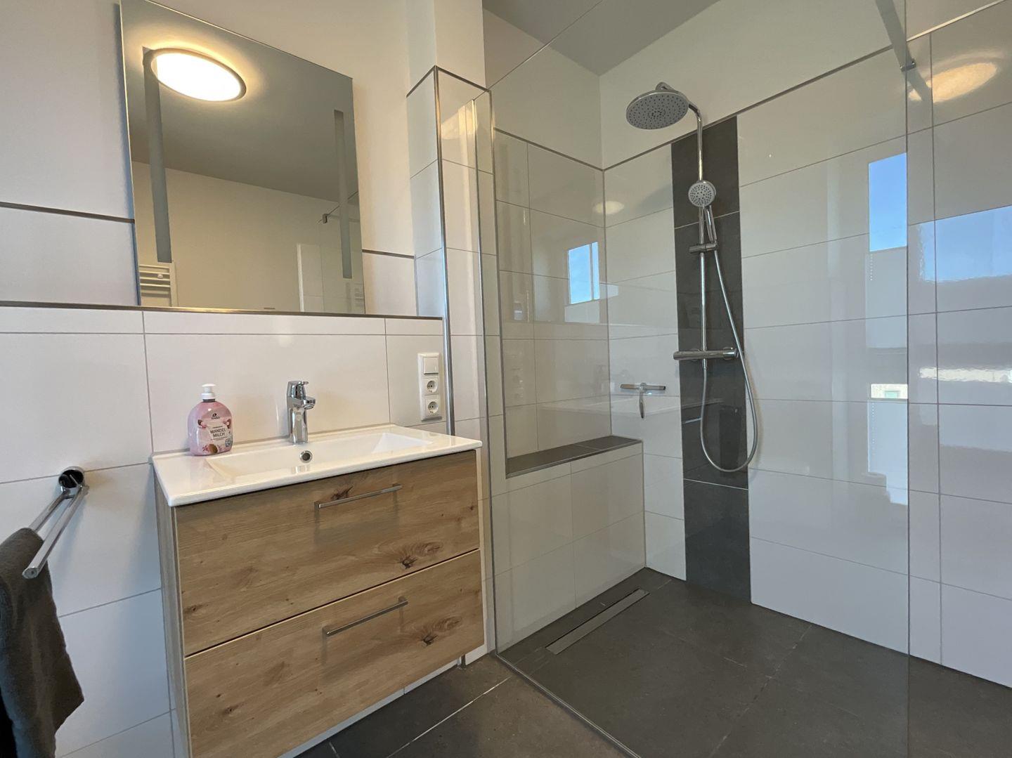 Das hochwertige Badezimmer ist mit bodengleicher Dusche, WC, Waschbecken, Spiegel, Fenster, Haartrockner und allen notwendigen Annehmlichkeiten eingerichtet. Eine Waschmaschine und ein Trockner stehen zur Eigennutzung bereit.