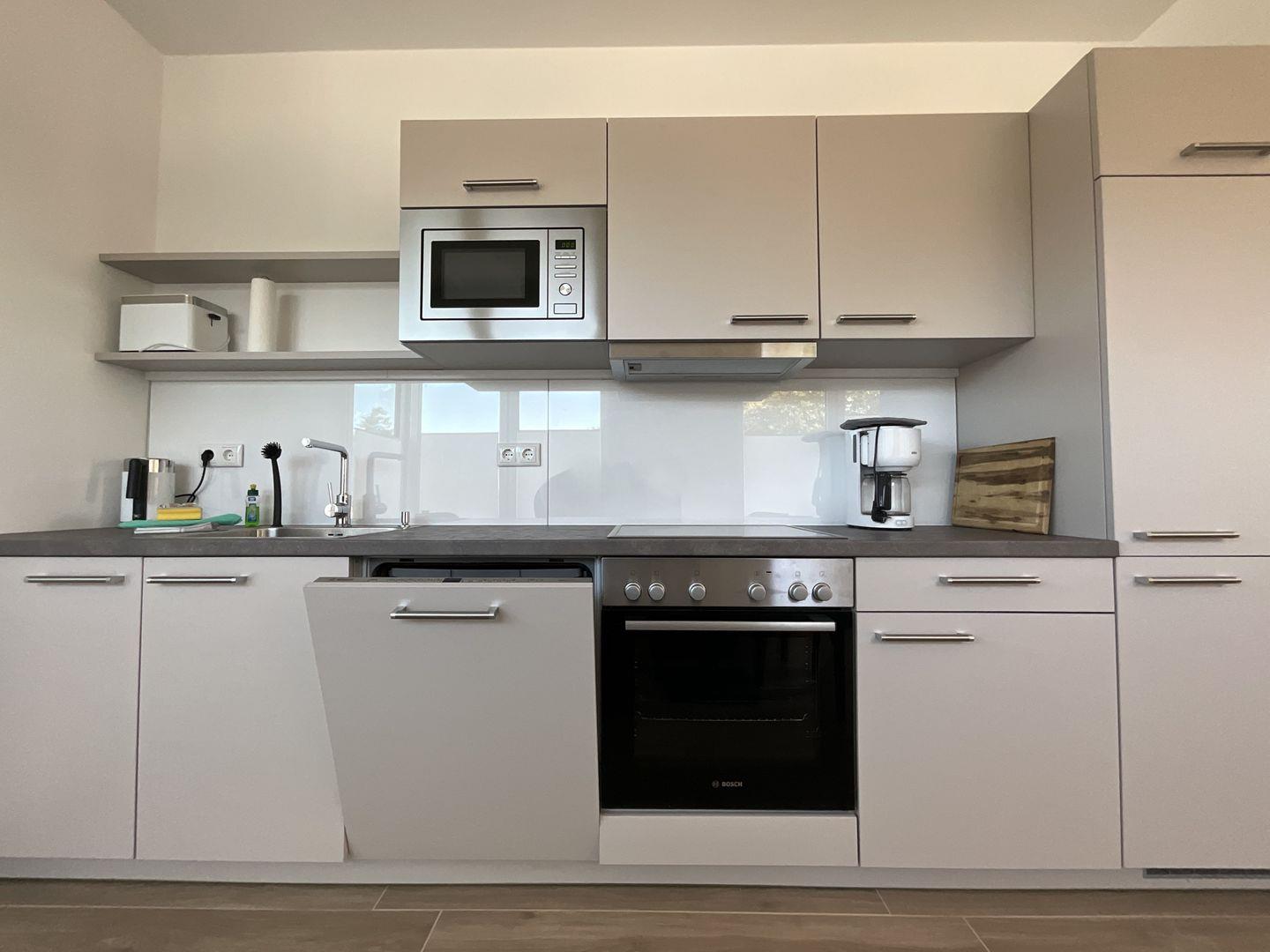 Küche und Haushalt: Einbauküche, Kühlschrank mit Gefrierfach, 4-Zonen Cerankochfeld, Backofen, Mikrowelle, Dunstabzugshaube, Geschirrspüler, Toaster, Wasserkocher, Kaffeefiltermaschine, hochwertiges Geschirr und Besteck