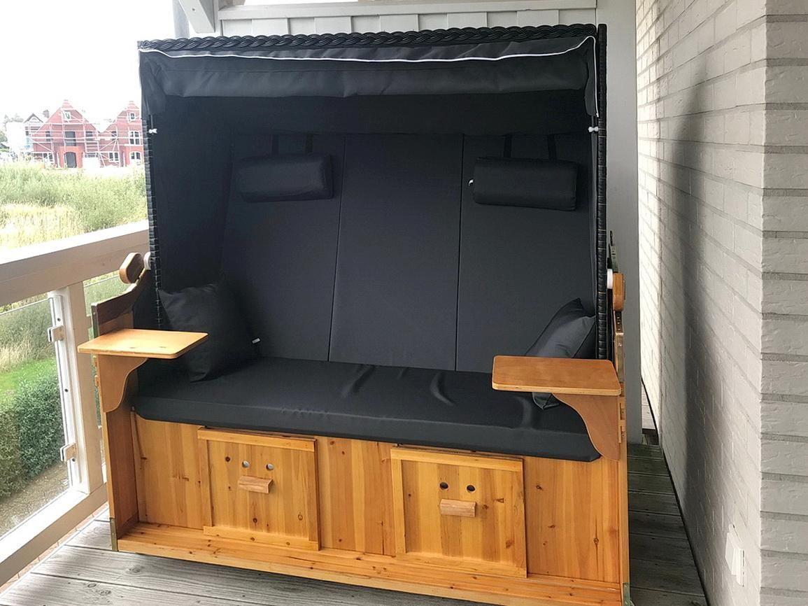 Das moderne Nichtraucher-Apartment verfügt über eine voll ausgestattete offene Küche mit Geschirrspüler, Kaffeemaschine, Toaster, Wasserkocher, Tiefkühlfach und Backofen. In den beiden Schlafzimmern stehen euch jeweils ein Doppelbett (1,80 x 2,00 m), im Wohn-Essbereich ein Flatscreen-TV, eine HiFi-Anlage und ein Elektrokamin zur Verfügung. Das hochwertige Badezimmer lässt keine Wünsche offen – ausgestattet mit einem Doppelwaschtisch, begehbarer Dusche, separatem WC und Bidet, Föhn und Kosmetikspiegel sowie der großzügigen eigenen Sauna lässt sich hier wunderbar entspannen. Das Apartment verfügt über einen Balkon mit eigenem Strandkorb und Gartenmöbeln. Von hier aus genießt ihr einen idyllischen Blick in das Hinterland. Ein Kinderbett kann gegen Entgelt aufgestellt werden und auf Wunsch könnt ihr einen Hochstuhl hinzubuchen.