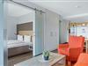 Im komfortablen Badezimmer mit begehbarer Dusche, WC und Bidet, Föhn und Kosmetikspiegel befindet sich eine eigene Sauna zur vollkommenen Entspannung in privater Atmosphäre. Das Apartment verfügt über einen Balkon mit Zugang sowohl vom Wohn- als auch vom Schlafzimmer. Von hier aus genießt ihr einen malerischen Ausblick ins Grüne.