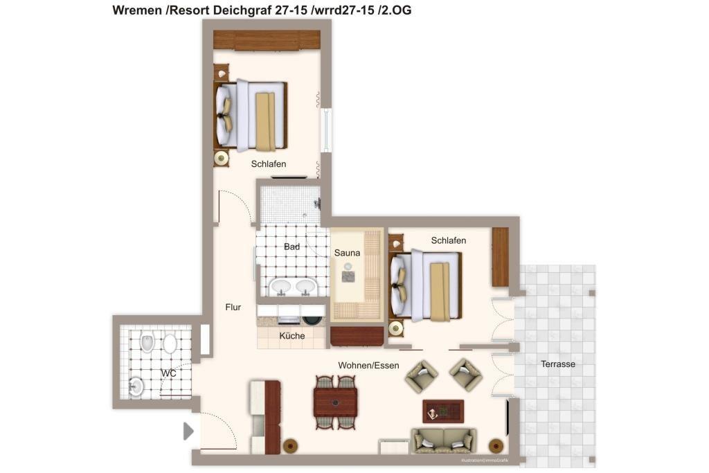 Die 69 m² große 3-Zimmer Ferienwohnung ist für bis zu 4 Personen geeignet. Besonders hervorzuheben sind die eigene Sauna des Apartments und der überdachte Balkon mit Blick Richtung Meer, Deich und ins Grüne.