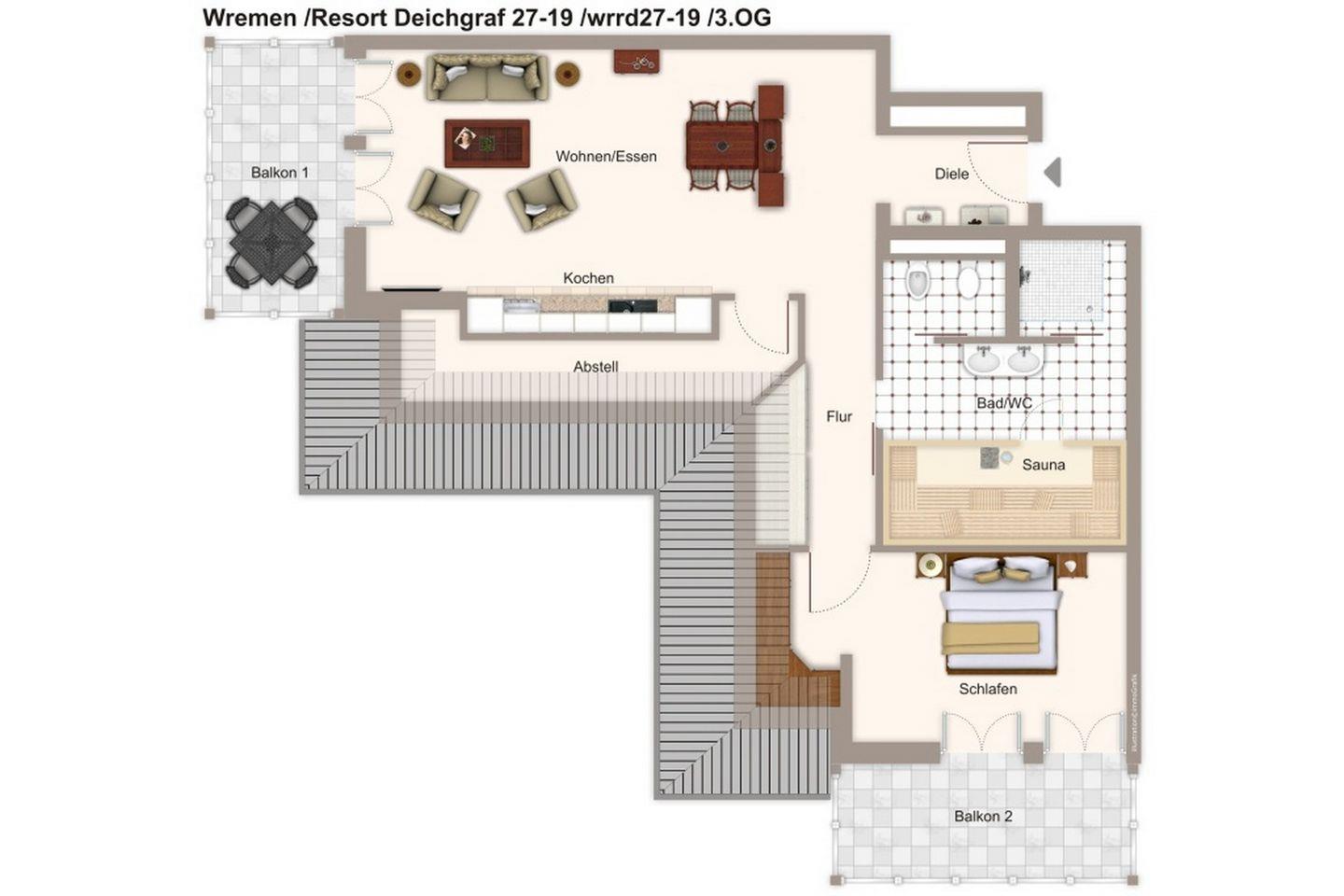 Das 88 m² große 2-Zimmer Penthaus mit Meerblick ist für bis zu 2 Personen geeignet. Besonders hervorzuheben sind die Sauna im Apartment und die zwei großzügigen Balkone, die ebenfalls Meerblick bieten.