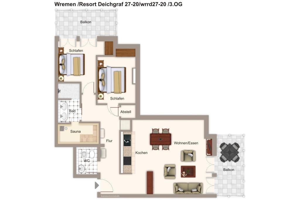Das 92 m² große 3-Zimmer Penthaus mit Meerblick ist für bis zu 4 Personen geeignet. Besonders hervorzuheben sind die Sauna im Apartment und die zwei großzügigen Balkone mit Meerblick bis hin zum Leuchtturm ‚Kleiner Preuße‘.