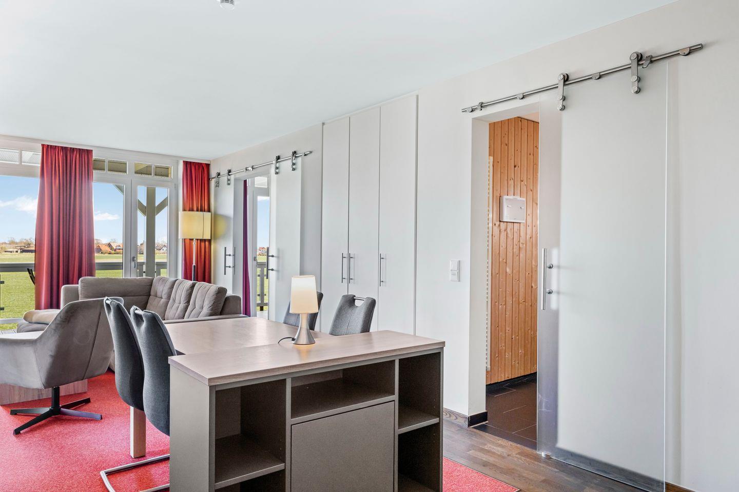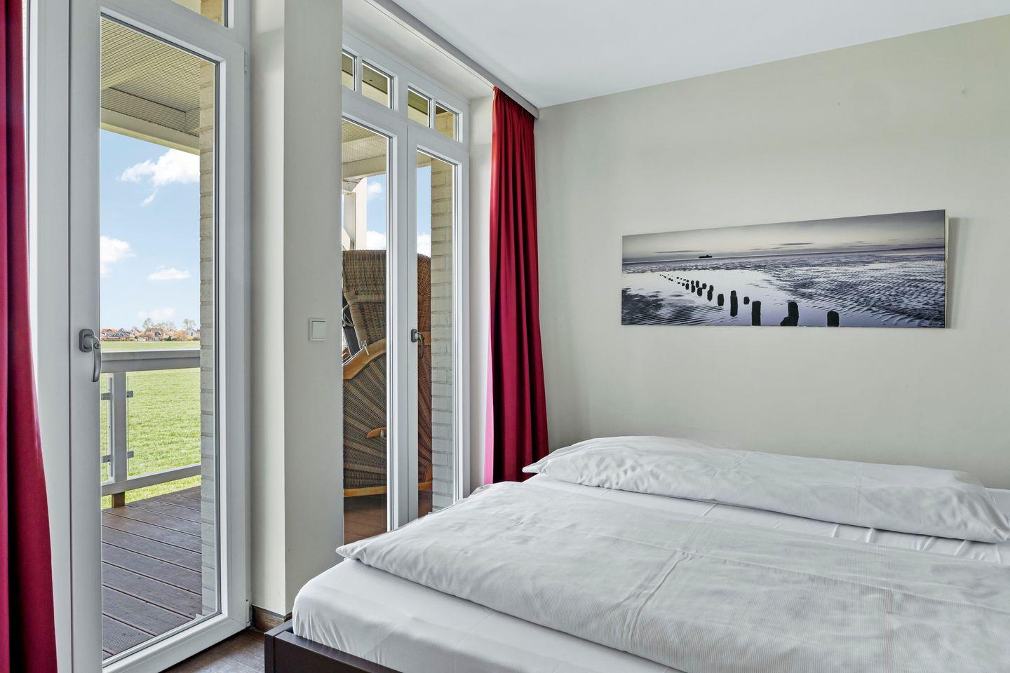 Das hochwertige Badezimmer ist eine richtige Wohlfühloase und lässt keine Wünsche offen - ausgestattet mit einem Doppelwaschtisch, begehbarer Dusche, WC und Bidet, Handtuchwärmer, Föhn und Kosmetikspiegel sowie der großzügigen eigenen Sauna lässt sich hier wunderbar entspannen. Das Apartment verfügt über einen großen, sonnigen und überdachten Balkon mit Strandkorb in Luxusausführung sowie Gartenmöbeln und einem wundervollen Blick ins malerische Wremer Umland. Der Balkon ist sowohl vom Wohn- als auch vom Schlafzimmer begehbar.