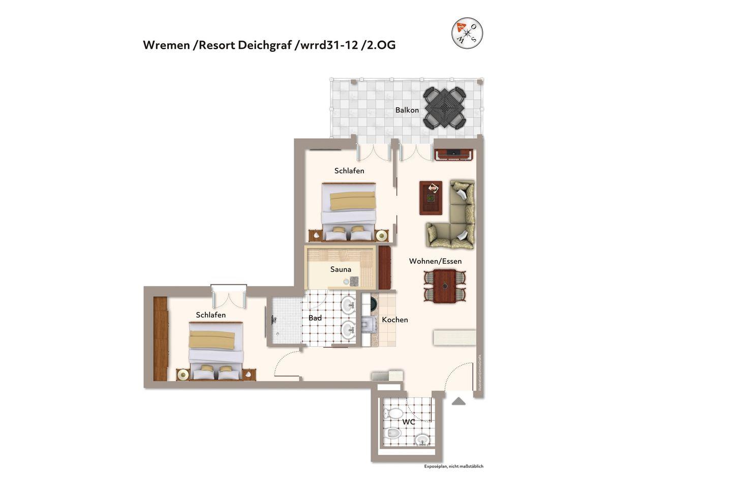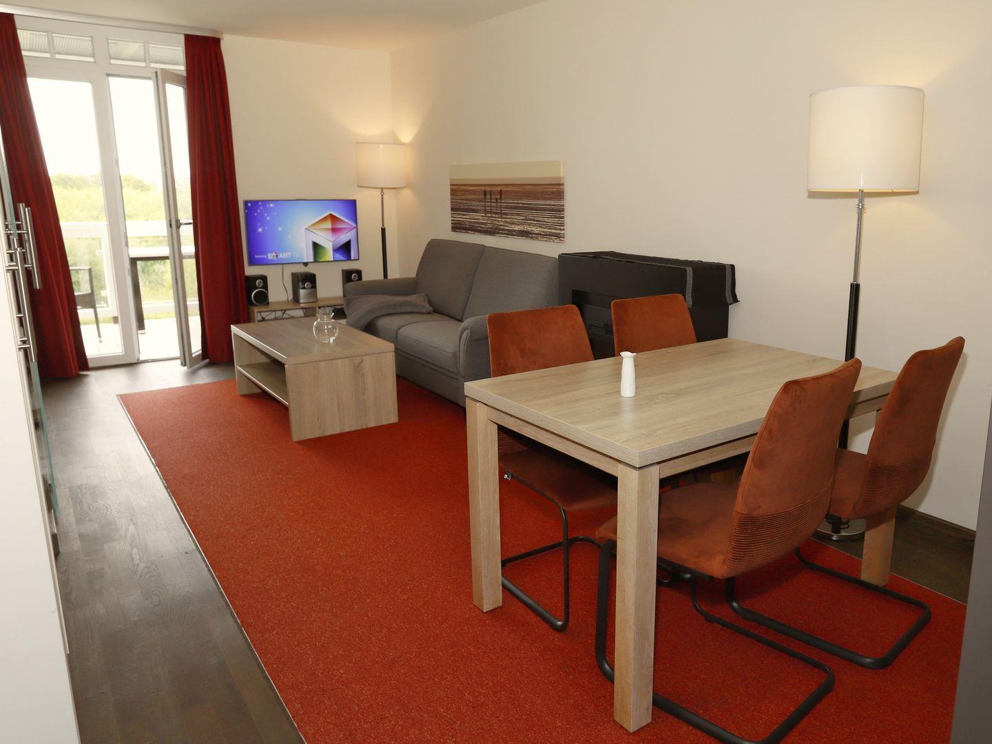 Die 70 m² große 3-Zimmer Ferienwohnung ist für bis zu 4 Personen geeignet. Besonders hervorzuheben ist die Sauna des Apartments und der großzügige überdachte Balkon mit Blick Richtung Deich und Nordsee.