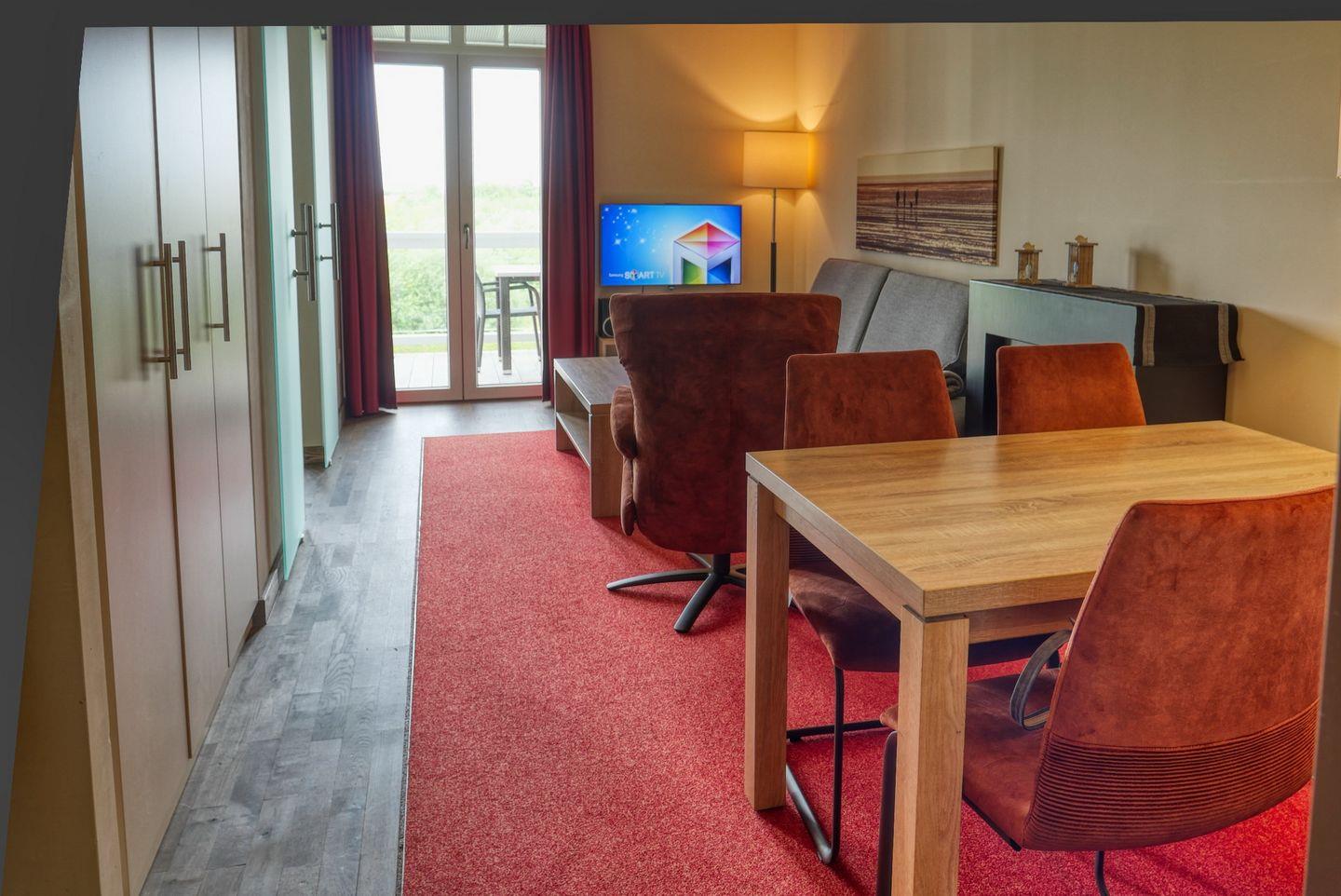 In den beiden Schlafzimmern stehen euch jeweils ein Doppelbett (1,80 x 2,00 m), im Wohn-Essbereich ein großer SMART-TV (42 Zoll), eine HiFi-Anlage und ein Elektrokamin zur Verfügung. Ein Kinderbett kann gegen Entgelt aufgestellt werden und auf Wunsch könnt ihr einen Hochstuhl hinzubuchen.