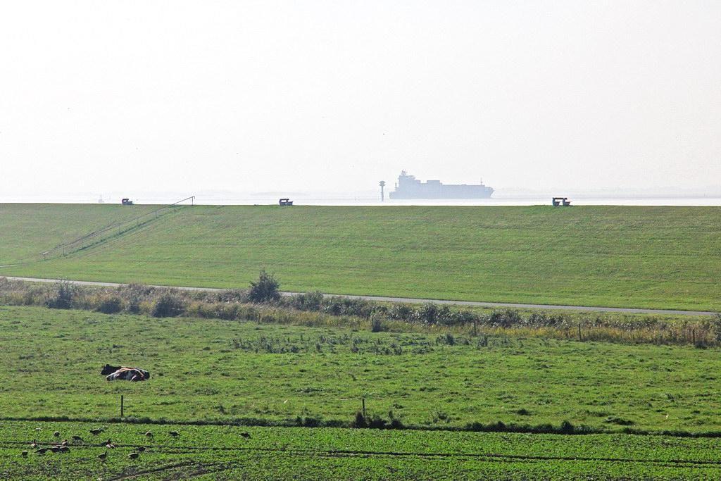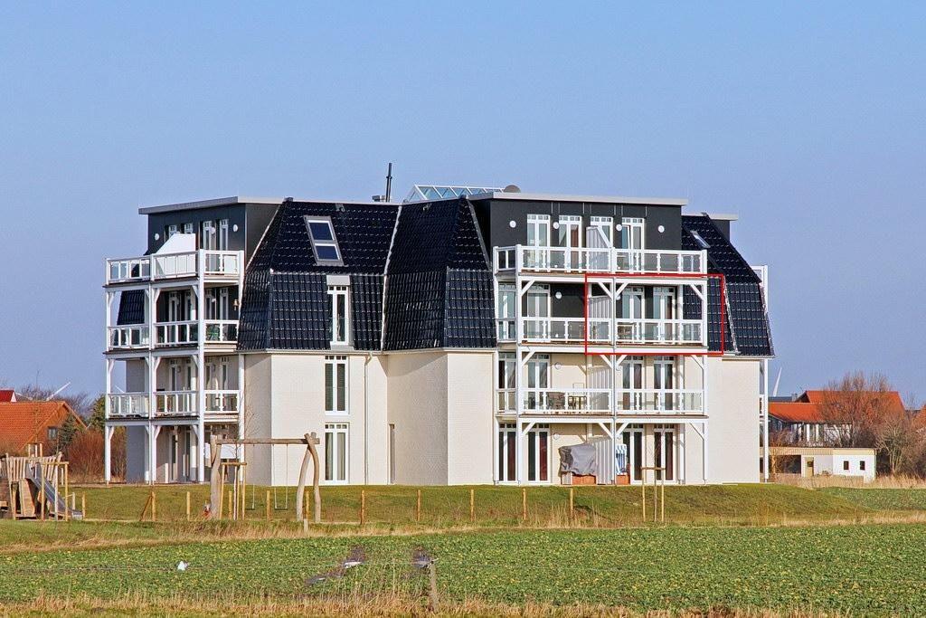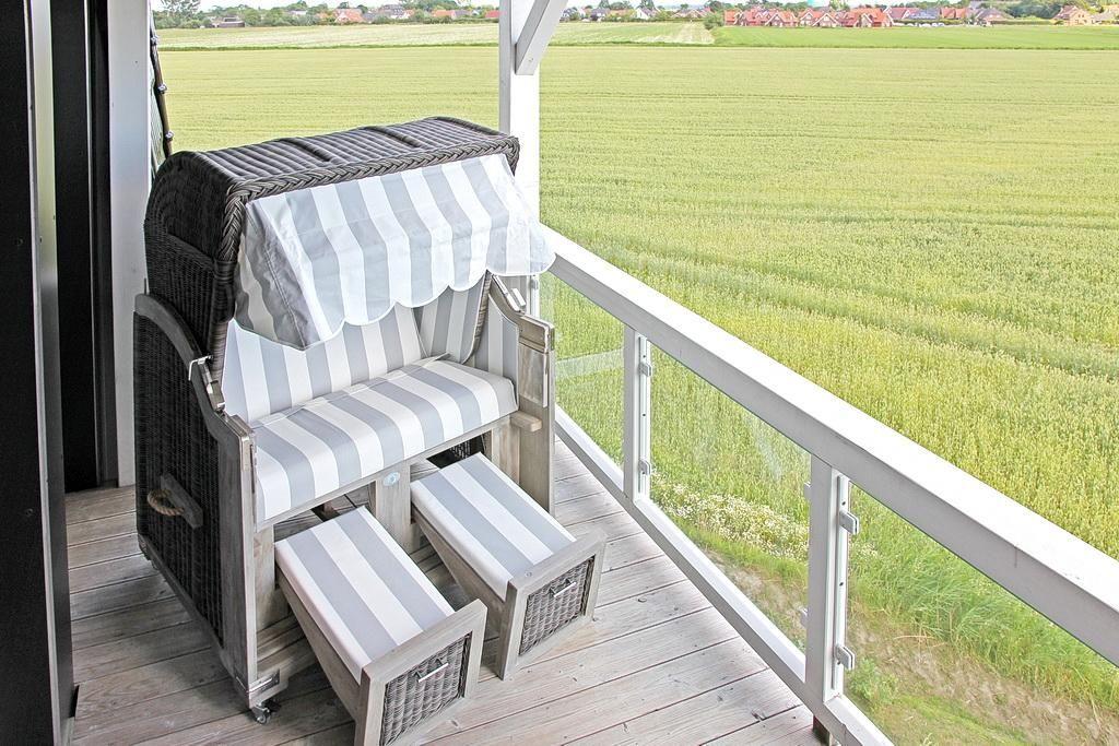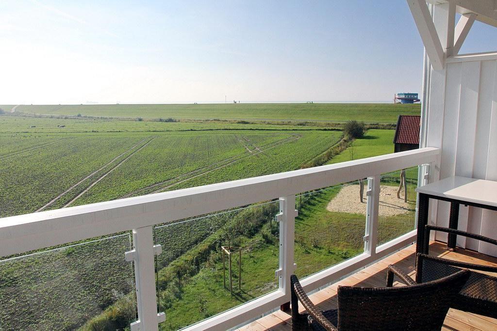 Das Apartment verfügt über einen großen, überdachten Balkon mit Gartenmöbeln und einem traumhaften Blick über die weiten Felder bis zum Meer und dem Nordseedeich. Im gemütlichen Strandkorb könnt ihr auf dem Balkon den Abend ausklingen lassen und die ein- und auslaufenden Schiffe beobachten.