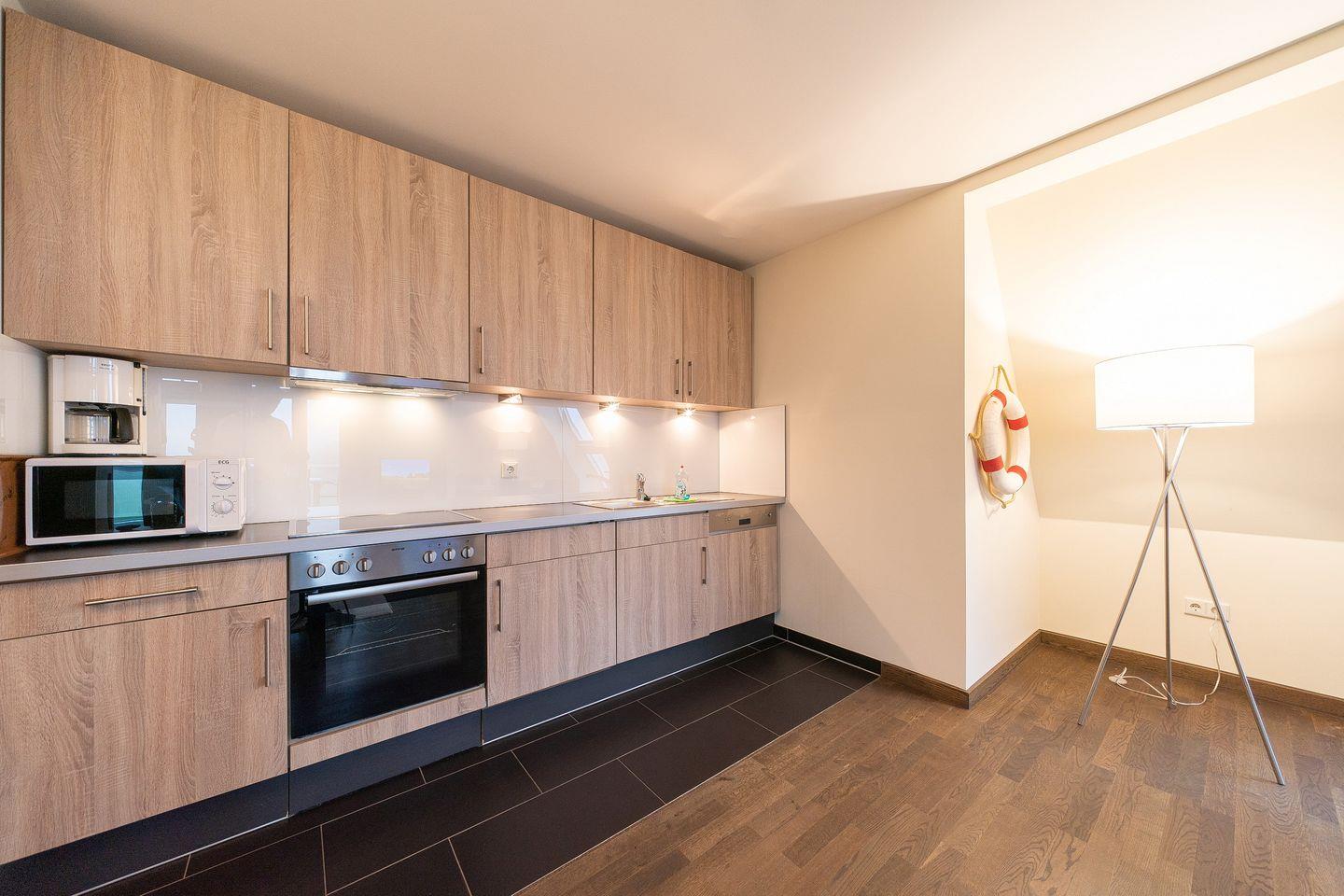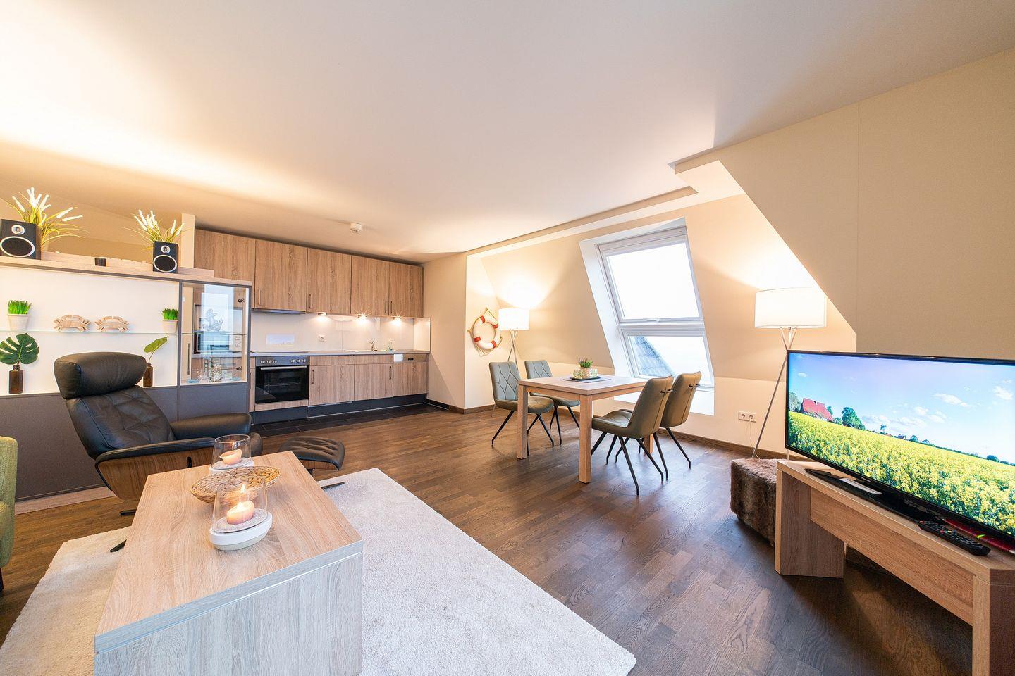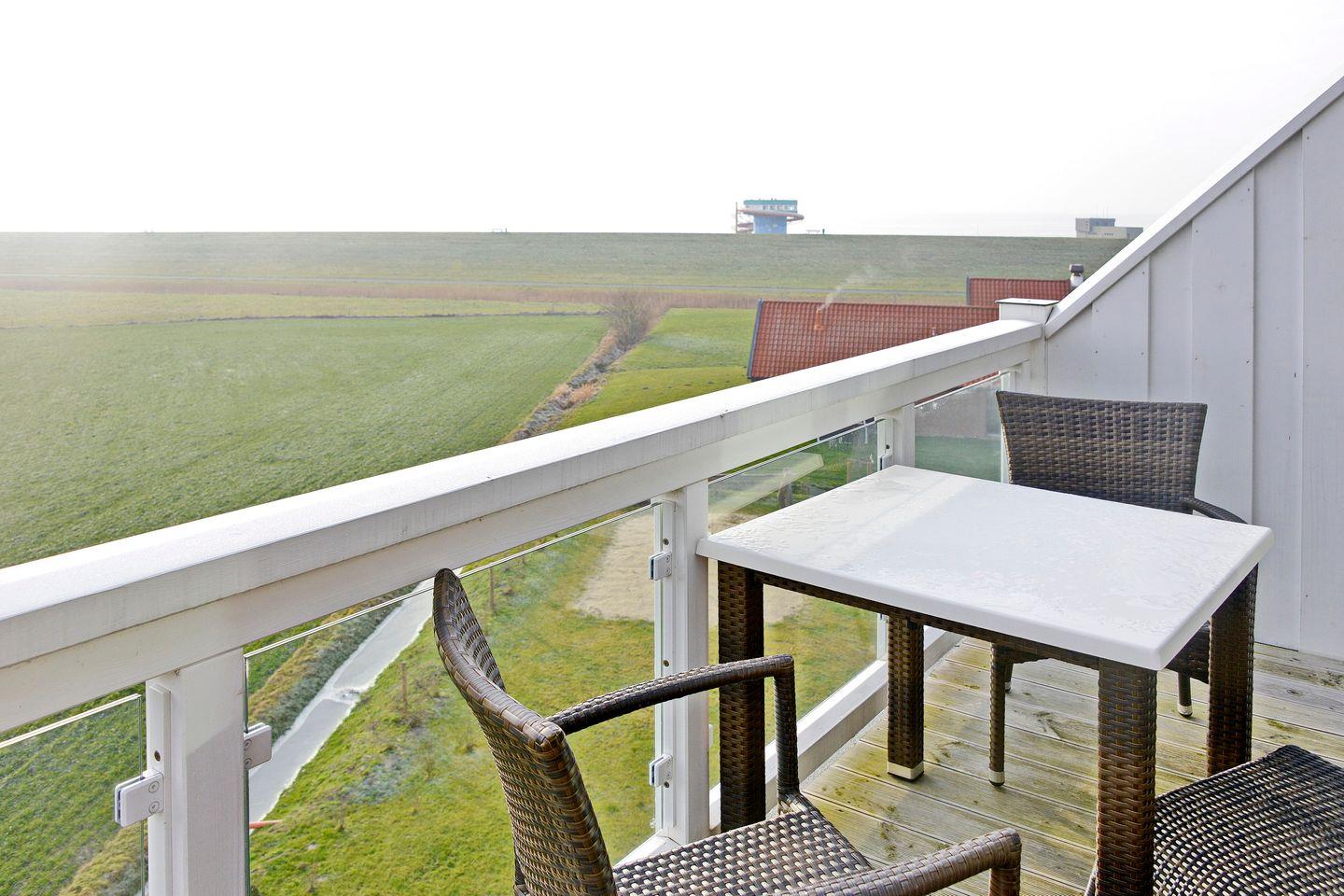 Das 92 m² große 3-Zimmer Penthaus-Apartment ist für bis zu 4 Personen geeignet. Besonders hervorzuheben sind hier die einmalige Lage, die private Sauna und die zwei großzügigen Balkone mit Meerblick zum Deich und der Nordsee bzw. Landblick über die Weiden und Felder.