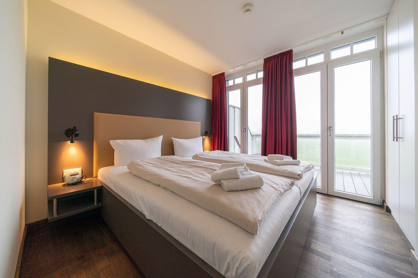 Das Nichtraucher-Apartment verfügt über kostenfreies WLAN und eine großzügig konzipierte und voll ausgestattete offene Küche mit Geschirrspüler, Kaffeemaschine, Toaster, Wasserkocher, Tiefkühlfach, Backofen und Mikrowelle. In den zwei Schlafzimmern steht euch jeweils ein Doppelbett, im Wohnbereich ein großer Flatscreen-TV, Minisafe, Telefon, eine HiFi-Anlage und ein Elektrokamin zur Verfügung. Ein Kinderbett kann gegen Entgelt aufgestellt werden und auf Wunsch könnt ihr einen Hochstuhl hinzubuchen.