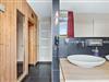 Im komfortablen Badezimmer mit begehbarer Dusche, WC und Bidet, Föhn und Kosmetikspiegel befindet sich eine eigene Sauna zur vollkommenen Entspannung in privater Atmosphäre. Das Apartment verfügt über eine ruhig gelegene und sonnige Terrasse mit Gartenmöbeln, eigenem Strandkorb und einem wunderschönem Blick ins Grüne.