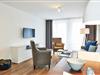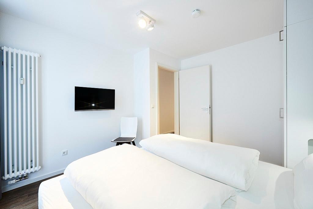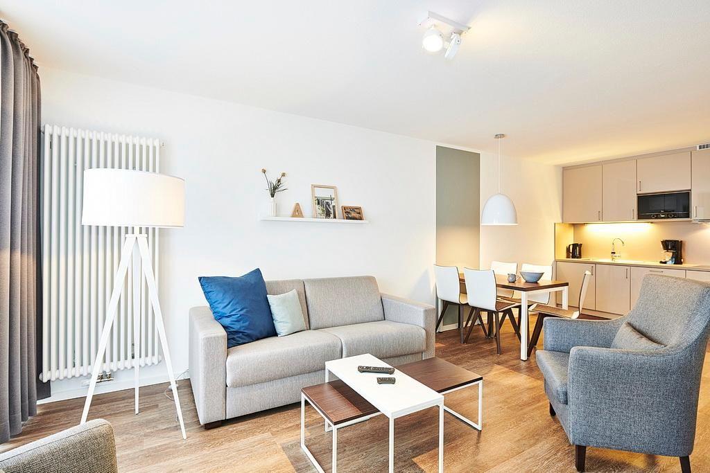 Das geschmackvoll eingerichtete Nichtraucher-Apartment verfügt über kostenfreies WLAN. Der Wohnbereich bietet eine voll ausgestattete offene Küchenzeile mit Geschirrspüler, Gefrierfach, Kaffeemaschine, Toaster, Wasserkocher und Mikrowelle mit Backfunktion sowie einen großen Flatscreen-TV und ein Radio. Das Apartment verfügt über einen Esstisch für 4 Personen und einen behaglichen Sitzbereich. Zwei separate Schlafzimmer stehen euch zur Verfügung. Eines davon verfügt über ein Doppelbett und einen eigenen Flatscreen-TV, ein weiteres über ein Etagenbett. Ein Kinderbett kann gegen Entgelt aufgestellt werden. Im stilvollen Badezimmer befinden sich eine große begehbare Dusche sowie ein Waschtisch mit Föhn und Kosmetikspiegel. Nach einem erlebnisreichen Urlaubstag lässt es sich auf dem überdachten und mit Gartenmöbeln ausgestatteten Balkon wunderbar entspannen.
