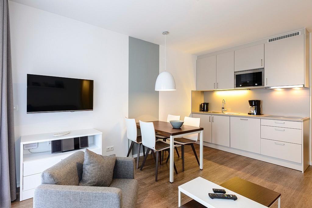 Das geschmackvoll eingerichtete Nichtraucher-Apartment verfügt über kostenfreies WLAN. Der Wohnbereich mit einer Schlafcouch bietet eine voll ausgestattete offene Küchenzeile mit Geschirrspüler, Gefrierfach, Kaffeemaschine, Toaster, Wasserkocher und Mikrowelle mit Backfunktion sowie einen großen Flatscreen-TV und ein Radio. Das Apartment verfügt über einen Esstisch für 5 Personen und einen behaglichen Sitzbereich. Ein Schlafzimmer mit Doppelbett und Flatscreen-TV und ein Alkoven-Schlafzimmer mit zwei Einzelbetten stehen euch zur Verfügung. Ein Kinderbett kann gegen Entgelt aufgestellt werden. Im stilvollen Badezimmer befinden sich eine große begehbare Dusche sowie ein Waschtisch mit Föhn und Kosmetikspiegel. Nach einem erlebnisreichen Urlaubstag lässt es sich auf den beiden überdachten und mit Gartenmöbeln für 5 Personen ausgestatteten Balkonen wunderbar entspannen. Die Balkone sind vom Wohnbereich bzw. vom Hauptschlafzimmer aus zugänglich.
