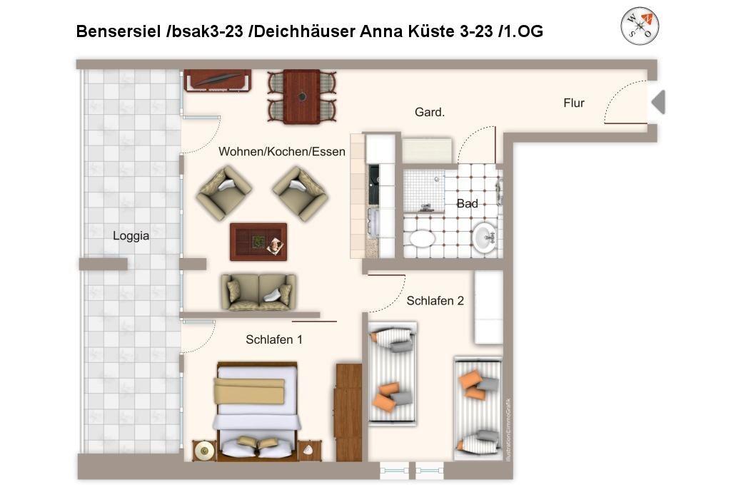 Die moderne und helle Ferienwohnung befindet sich im ersten Obergeschoss des Deichhauses 3, im Herzen von Bensersiel, nur 500 Meter vom Sandstrand und der Nordsee entfernt. In der unmittelbaren Umgebung findet ihr zahlreiche Einkaufsmöglichkeiten, Restaurants und Cafés; auch die Nordseetherme, das Meerwasserfreibad mit großer Wasserrutsche und der Sportthemenpark sind fußläufig gut erreichbar. Unser Tipp: Macht einen Tagesausflug nach Langeoog - die knapp einstündige Fährverbindung zwischen Bensersiel und der autofreien Insel verkehrt mehrfach täglich. Der Fähranleger liegt nur einen kleinen Spaziergang (ca. 1 km) von den Deichhäusern entfernt.