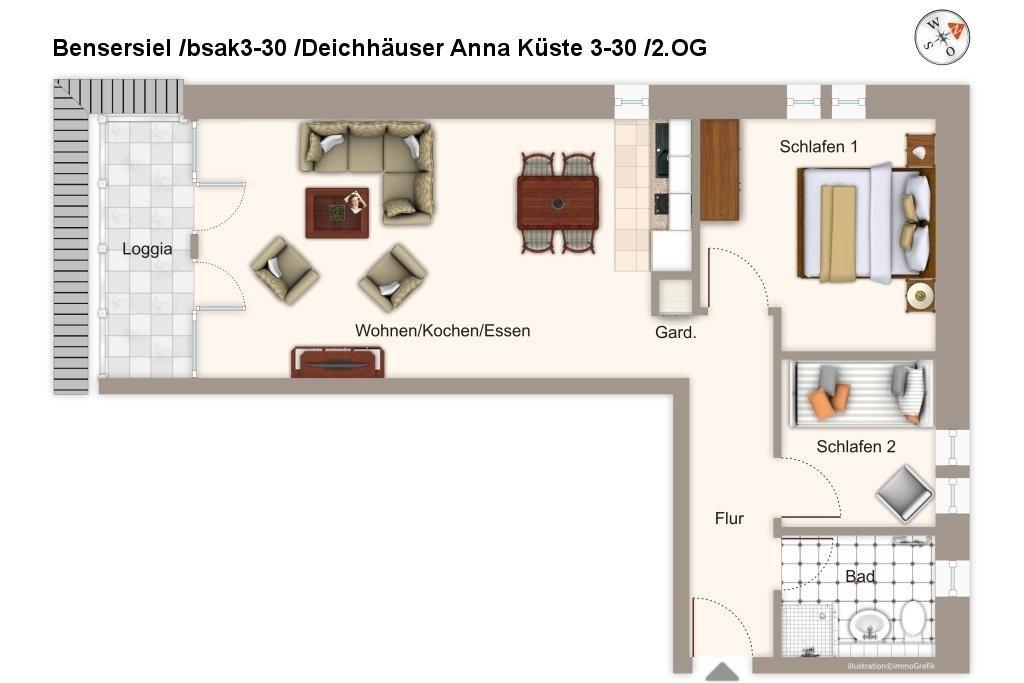 Die moderne und helle Ferienwohnung befindet sich im zweiten Obergeschoss des Deichhauses 3, im Herzen von Bensersiel, nur 500 Meter vom Sandstrand und der Nordsee entfernt. In der unmittelbaren Umgebung findet ihr zahlreiche Einkaufsmöglichkeiten, Restaurants und Cafés; auch die Nordseetherme, das Meerwasserfreibad mit großer Wasserrutsche und der Sportthemenpark sind fußläufig gut erreichbar. Unser Tipp: Macht einen Tagesausflug nach Langeoog - die knapp einstündige Fährverbindung zwischen Bensersiel und der autofreien Insel verkehrt mehrfach täglich. Der Fähranleger liegt nur einen kleinen Spaziergang (ca. 1 km) von den Deichhäusern entfernt.
