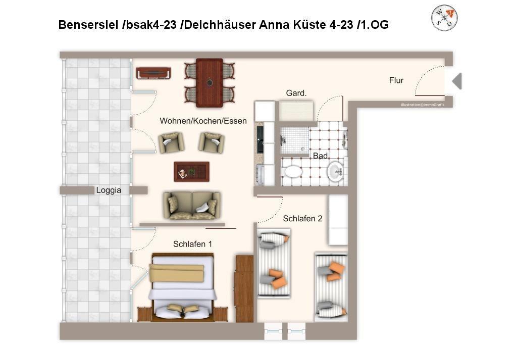 Die moderne und helle Ferienwohnung befindet sich im ersten Obergeschoss des Deichhauses 4, im Herzen von Bensersiel, nur 500 Meter vom Sandstrand und der Nordsee entfernt. In der unmittelbaren Umgebung findet ihr zahlreiche Einkaufsmöglichkeiten, Restaurants und Cafés; auch die Nordseetherme, das Meerwasserfreibad mit großer Wasserrutsche und der Sportthemenpark sind fußläufig gut erreichbar. Unser Tipp: Macht einen Tagesausflug nach Langeoog - die knapp einstündige Fährverbindung zwischen Bensersiel und der autofreien Insel verkehrt mehrfach täglich. Der Fähranleger liegt nur einen kleinen Spaziergang (ca. 1 km) von den Deichhäusern entfernt.