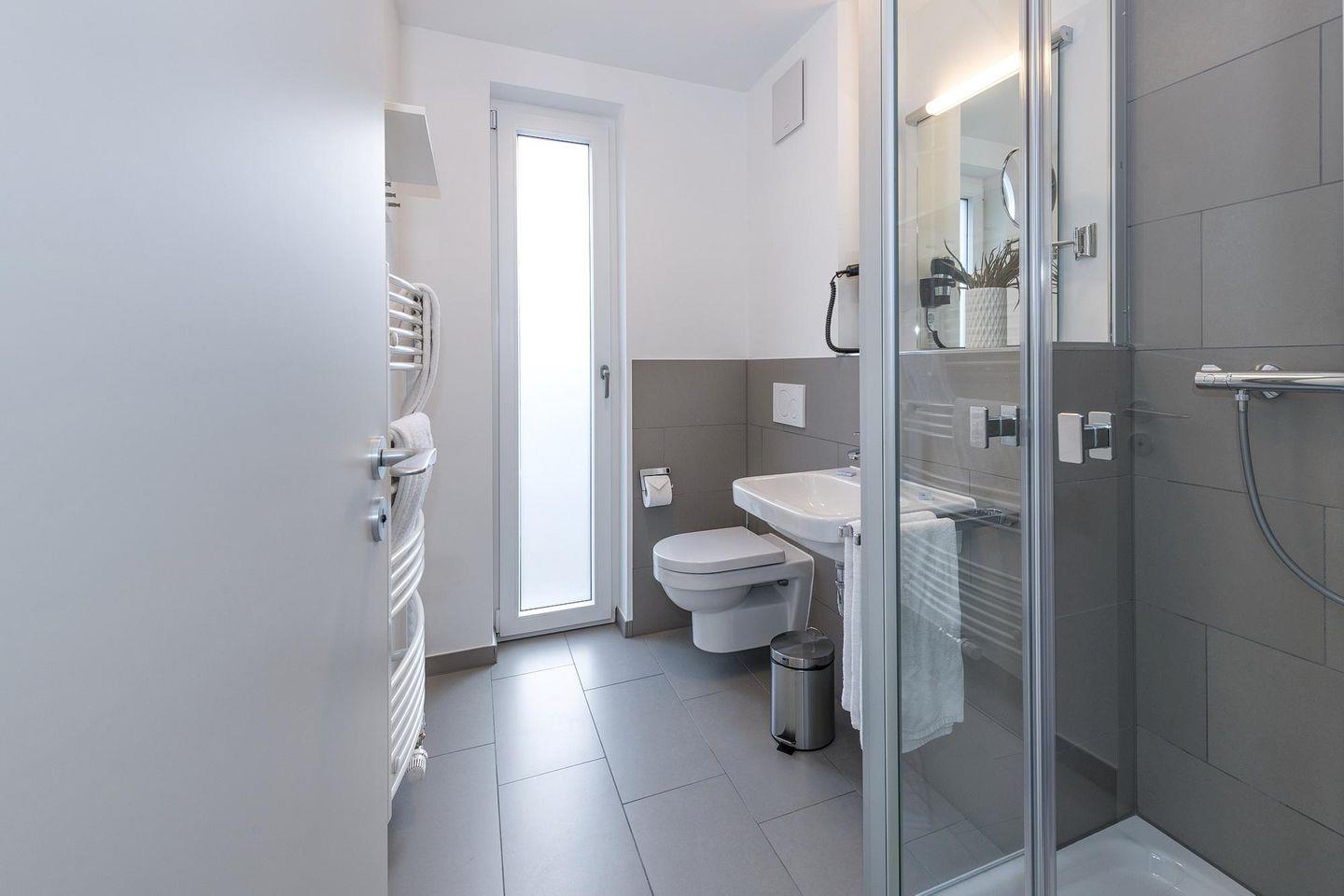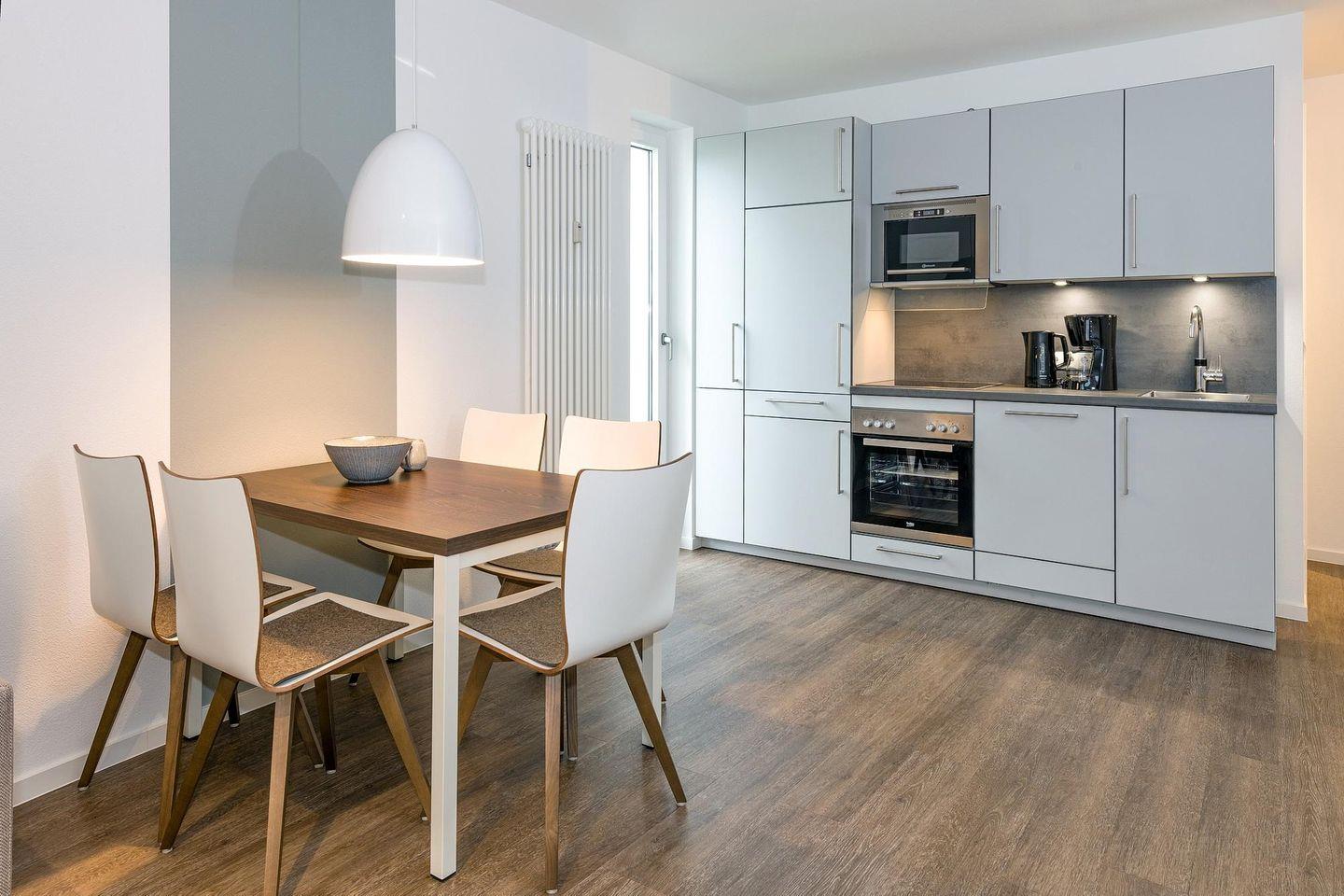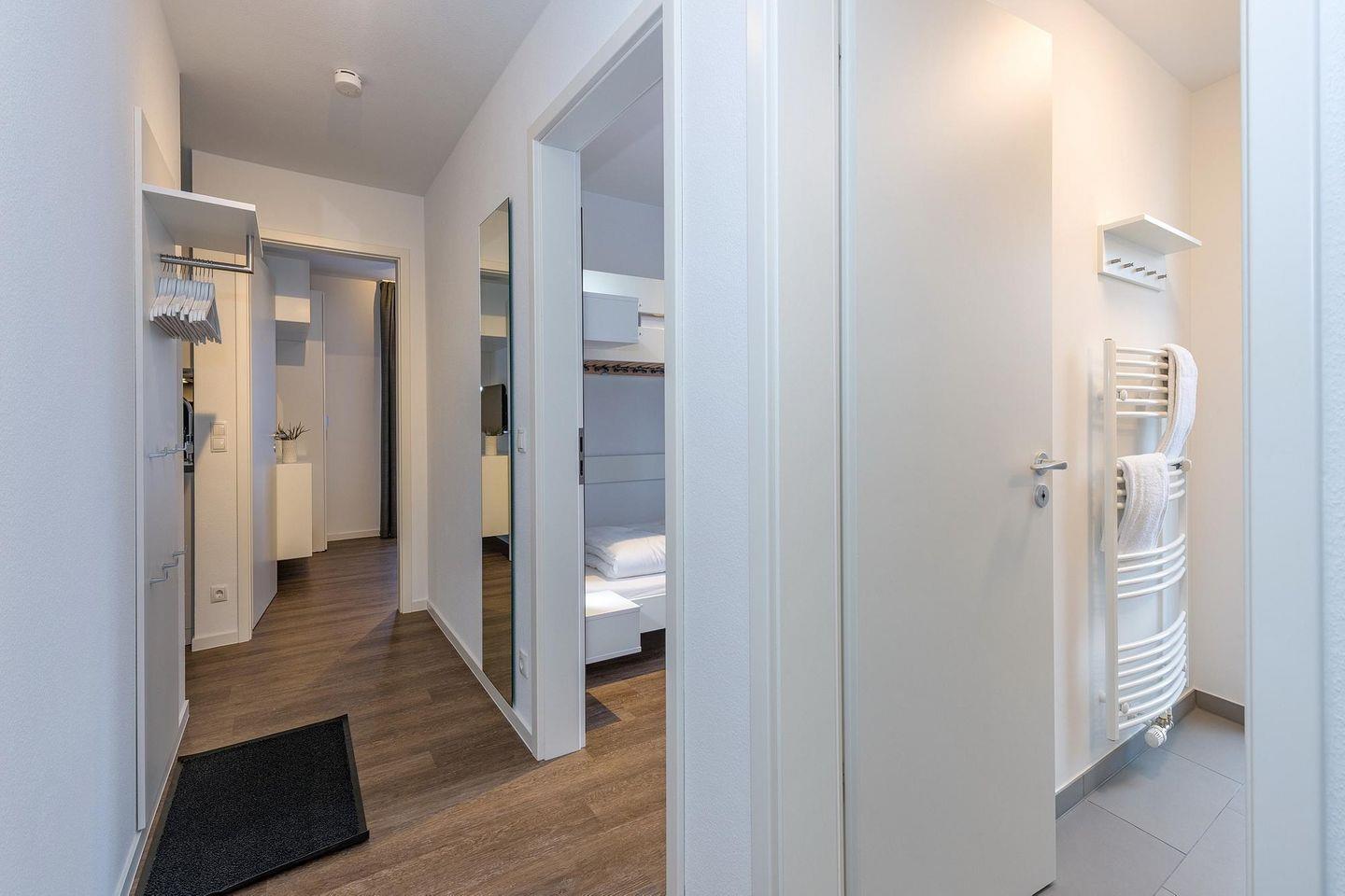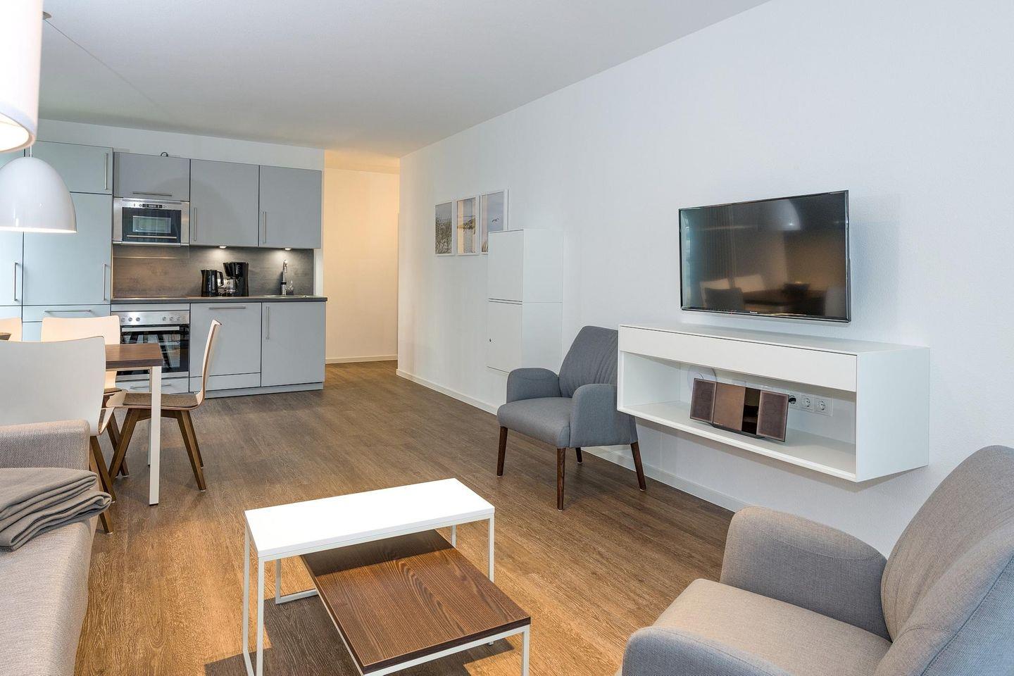 Das geschmackvoll eingerichtete Nichtraucher-Apartment verfügt über kostenfreies WLAN. Der Wohnbereich mit Schlafcouch, bietet eine voll ausgestattete offene Küchenzeile mit Geschirrspüler, Gefrierfach, Kaffeemaschine, Toaster, Wasserkocher und Mikrowelle, Backofen sowie einen großen Flatscreen-TV und ein Radio. Das Apartment verfügt über einen Esstisch für 5 Personen und einen behaglichen Sitzbereich. Zwei separate Schlafzimmer stehen euch zur Verfügung. Eines davon verfügt über ein Doppelbett (1,80 x 2,00 m) und einen eigenen Flatscreen-TV, ein weiteres über ein Etagenbett (0,90, x 2,00 m). Ein Kinderbett kann gegen Entgelt aufgestellt werden. Im stilvollen Badezimmer befinden sich eine große begehbare Dusche sowie ein Waschtisch mit Föhn und Kosmetikspiegel. Nach einem erlebnisreichen Urlaubstag lässt es sich auf der überdachten und mit Gartenmöbeln ausgestatteten Terrasse wunderbar entspannen.