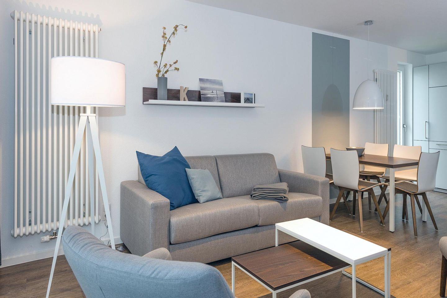 Die 59 m² große 3-Zimmer Ferienwohnung ist für bis zu 5 Personen geeignet. Besonders hervorzuheben ist die Terrasse in sonniger Süd-West-Lage mit eigener kleiner Grünfläche. Hier lässt sich den ganzen Tag das wohltuende Meeresklima des Nordseeheilbades genießen.