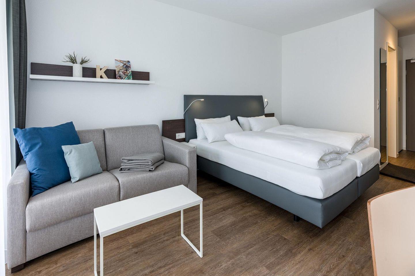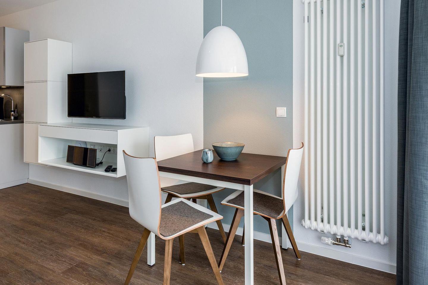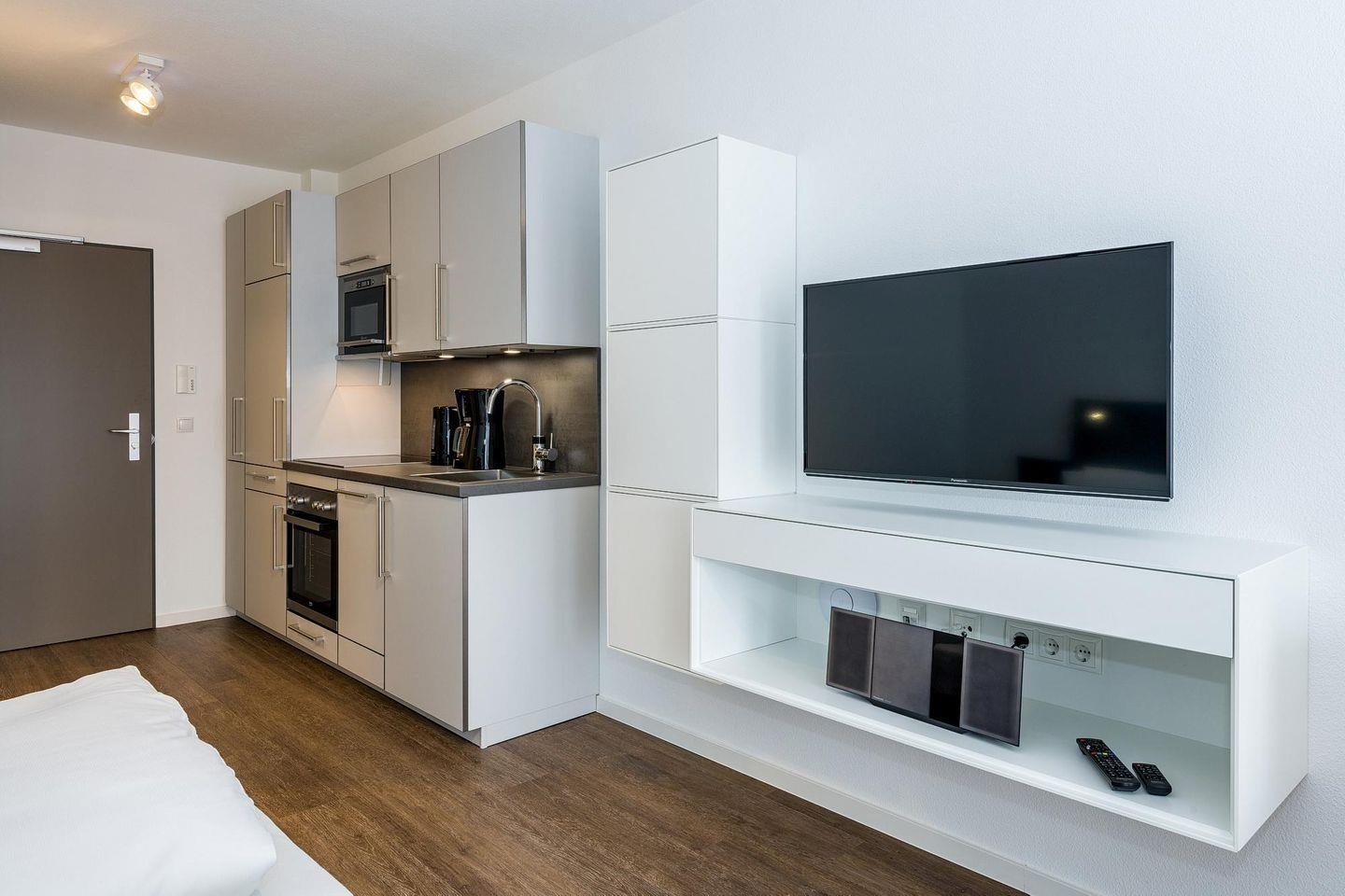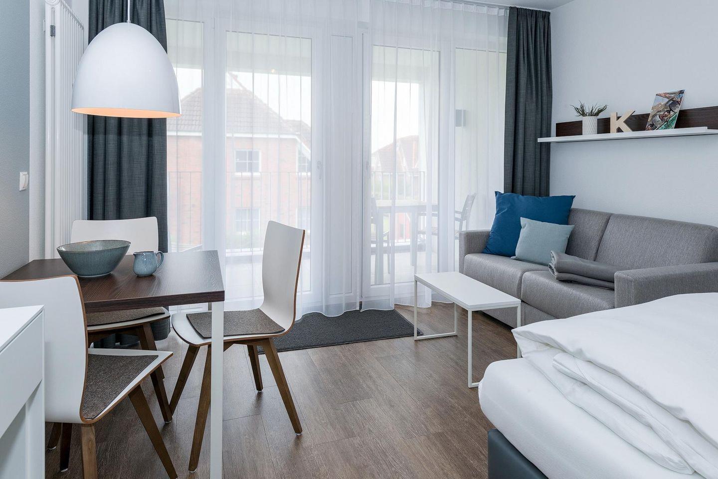 Das geschmackvoll eingerichtete Nichtraucher-Apartment verfügt über kostenfreies WLAN. Der Wohn-Schlafbereich bietet eine voll ausgestattete offene Küchenzeile mit Geschirrspüler, Gefrierfach, Backofen, Kaffeemaschine, Toaster, Wasserkocher und Mikrowelle sowie ein Doppelbett, einen großen Flatscreen-TV und ein Radio. Das Apartment verfügt über einen Esstisch für 3 Personen und einen behaglichen kleinen Sitzbereich mit Schlafcouch. Ein Kinderbett kann gegen Entgelt aufgestellt werden. Im stilvollen Badezimmer befinden sich eine große begehbare Dusche sowie ein Waschtisch mit Föhn und Kosmetikspiegel. Nach einem erlebnisreichen Urlaubstag entspannt ihr auf der überdachten und mit Gartenmöbeln für 3 Personen ausgestatteten Balkon.
