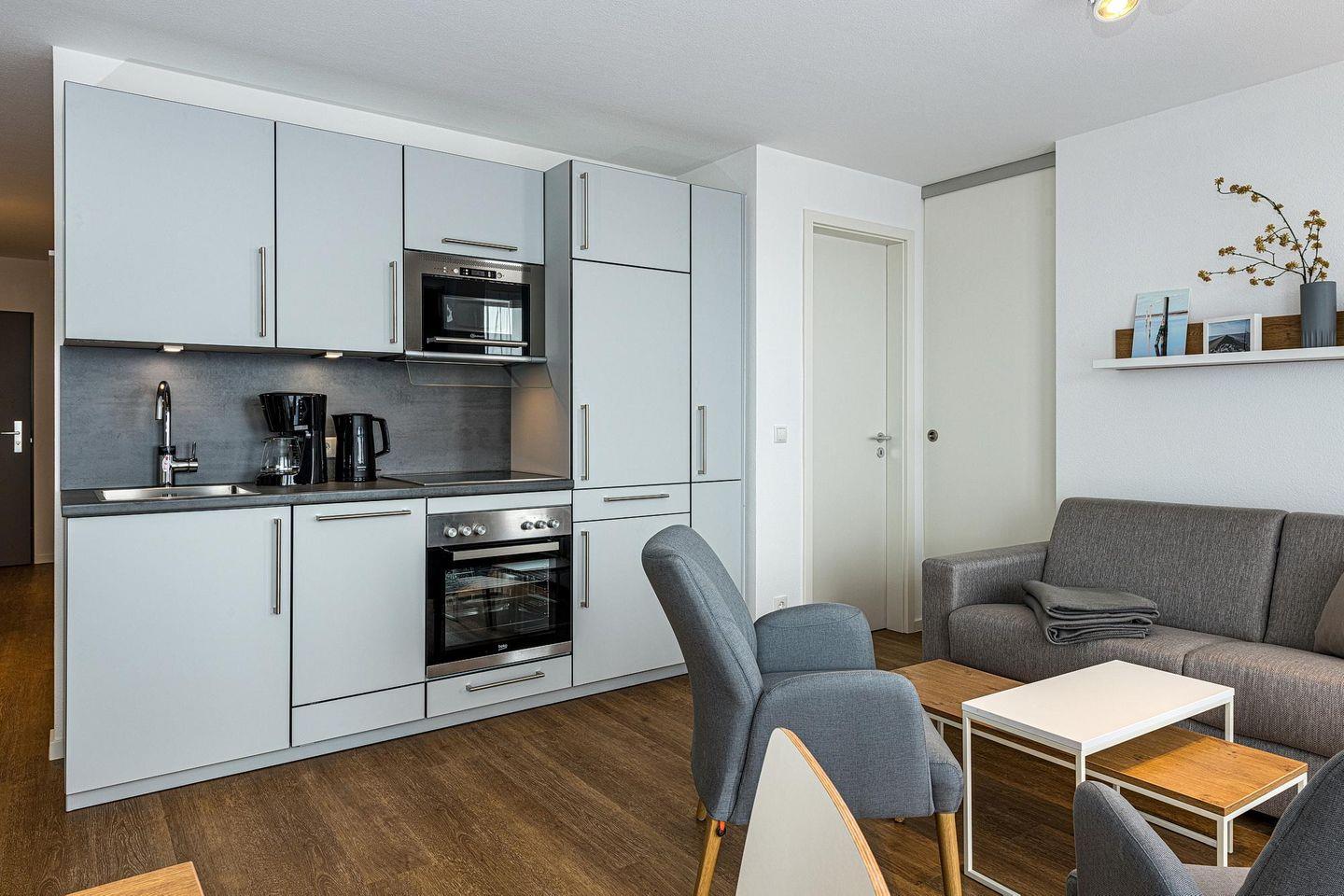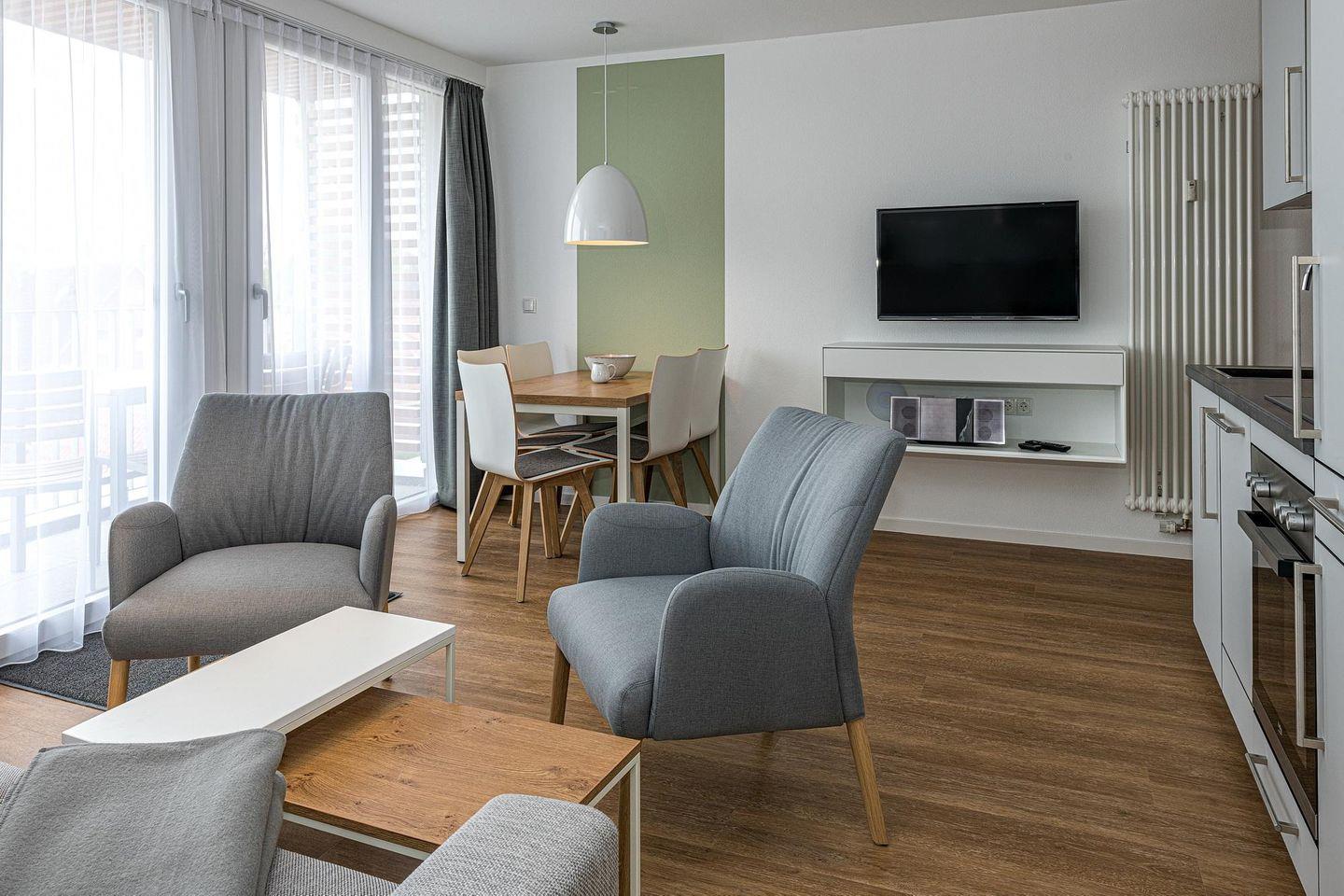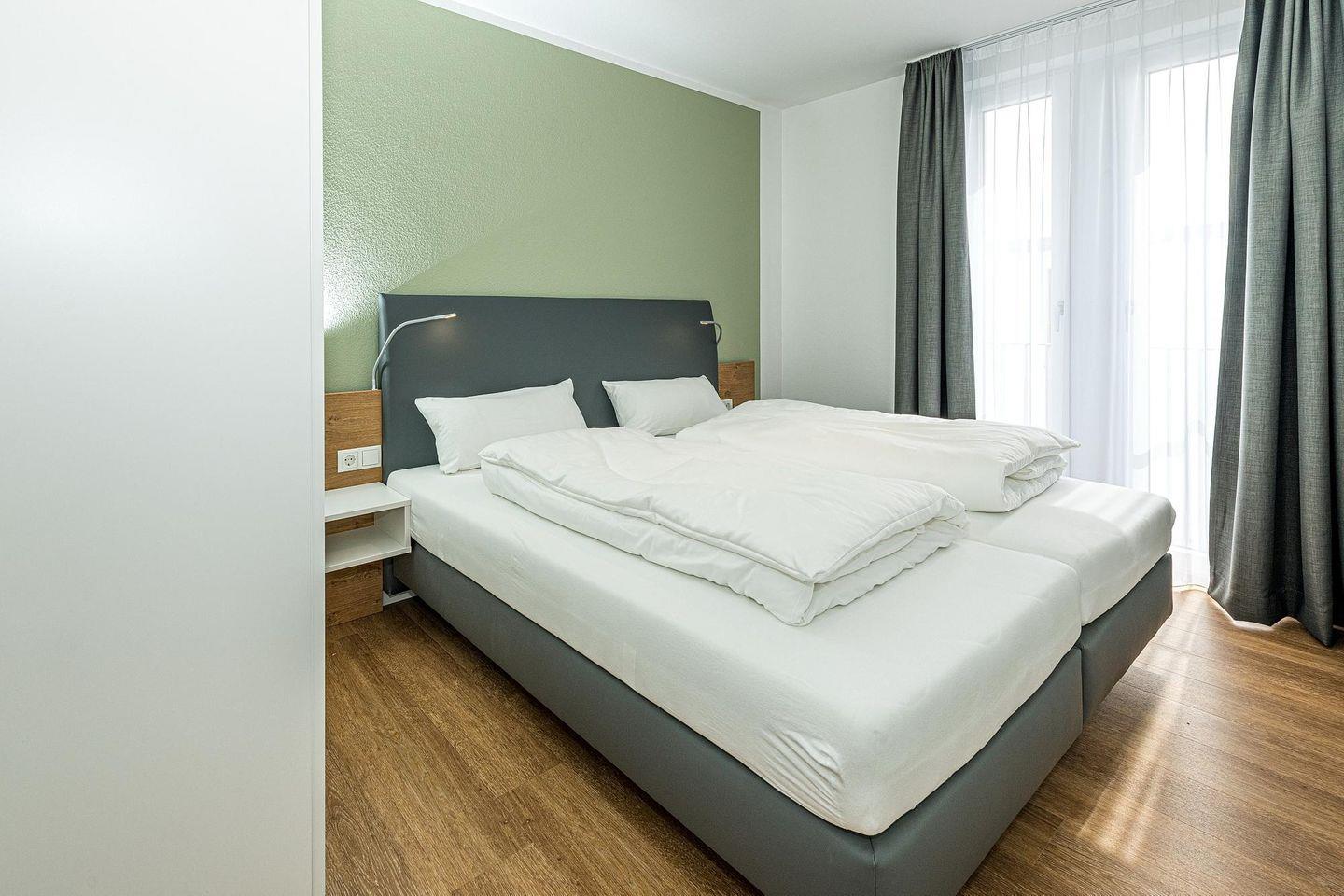 Das geschmackvoll eingerichtete Nichtraucher-Apartment verfügt über kostenfreies WLAN. Der Wohnbereich bietet eine voll ausgestattete offene Küchenzeile mit Geschirrspüler, Gefrierfach, Backofen, Kaffeemaschine, Toaster, Wasserkocher und Mikrowelle sowie einen großen Flatscreen-TV und ein Radio. Das Apartment verfügt über einen Esstisch für 5 Personen und einen behaglichen Sitzbereich mit Schlafcouch. Zwei separate Schlafzimmer mit jeweils einem Doppelbett stehen euch zur Verfügung. Eines davon verfügt zudem über einen eigenen Flatscreen-TV. Im stilvollen Badezimmer befinden sich eine große begehbare Dusche sowie ein Waschtisch mit Föhn und Kosmetikspiegel. Nach einem erlebnisreichen Urlaubstag entspannt ihr auf dem überdachten und mit Gartenmöbeln für 5 Personen ausgestatteten Balkon. Der Balkon ist vom Wohnbereich und vom Hauptschlafzimmer aus zugänglich.