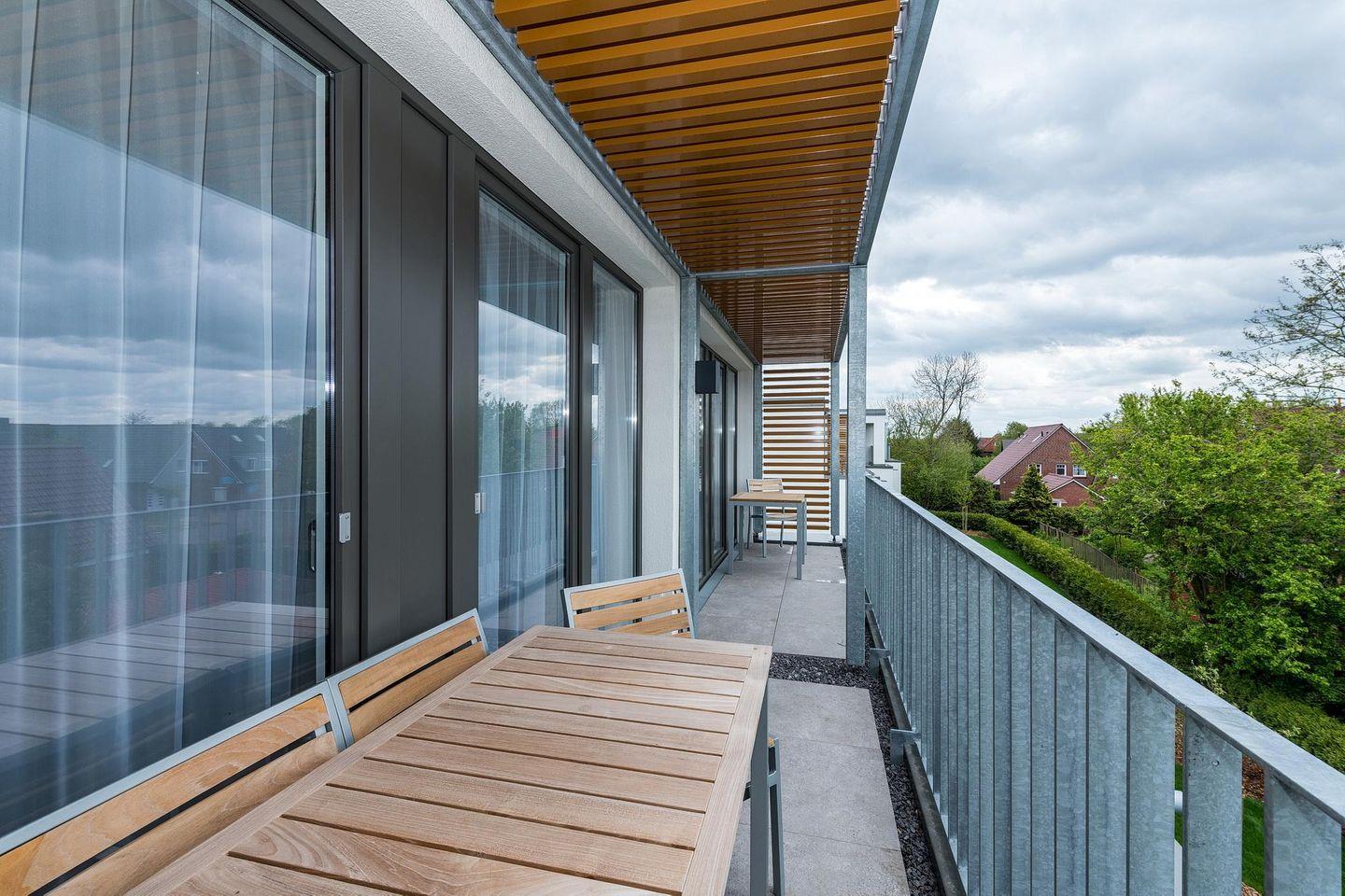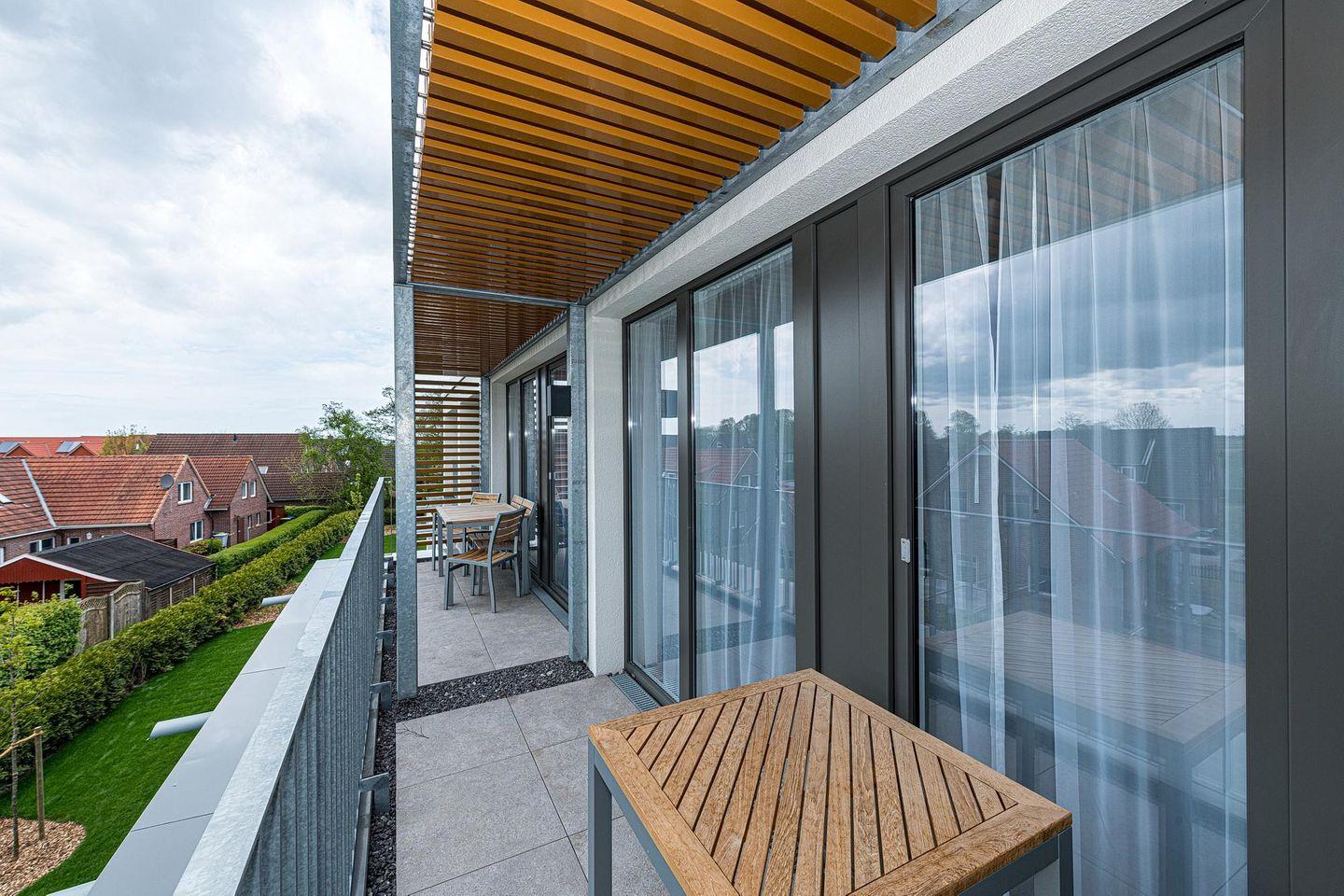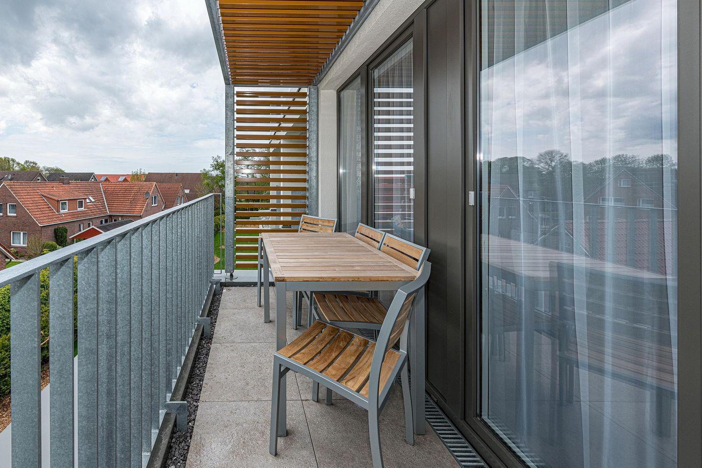Die 58 m² große 3-Zimmer Ferienwohnung ist für bis zu 5 Personen geeignet. Besonders hervorzuheben ist der großzügige und überdachte Balkon, ähnlich einer Loggia, in sonniger Süd-West-Lage. Hier lässt sich bis zum Abend das wohltuende Meeresklima und die Sonne genießen.