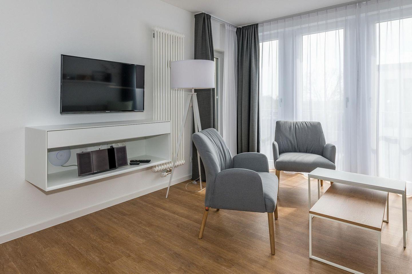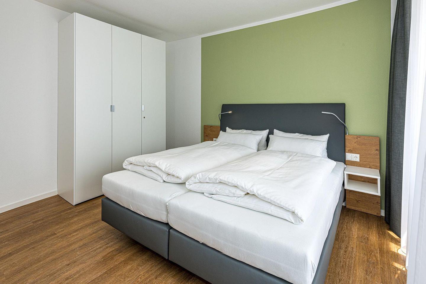Das geschmackvoll eingerichtete Nichtraucher-Apartment verfügt über kostenfreies WLAN. Der Wohnbereich mit Schlafcouch bietet eine voll ausgestattete offene Küchenzeile mit Geschirrspüler, Gefrierfach, Backofen, Kaffeemaschine, Toaster, Wasserkocher und Mikrowelle sowie einen großen Flatscreen-TV und ein Radio. Das Apartment verfügt über einen Esstisch für 5 Personen und einen behaglichen Sitzbereich. Zwei separate Schlafzimmer stehen euch zur Verfügung. Eines davon verfügt über ein Doppelbett und einen eigenen Flatscreen-TV, ein weiteres über zwei Einzelbetten. Ein Kinderbett kann gegen Entgelt aufgestellt werden. Im stilvollen Badezimmer befinden sich eine große begehbare Dusche sowie ein Waschtisch mit Föhn und Kosmetikspiegel. Nach einem erlebnisreichen Urlaubstag entspannt ihr auf dem überdachten und mit Gartenmöbeln für 4 Personen ausgestatteten Balkon.