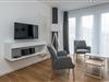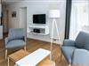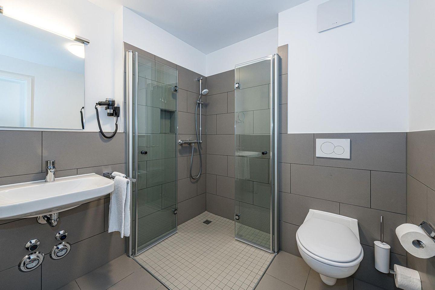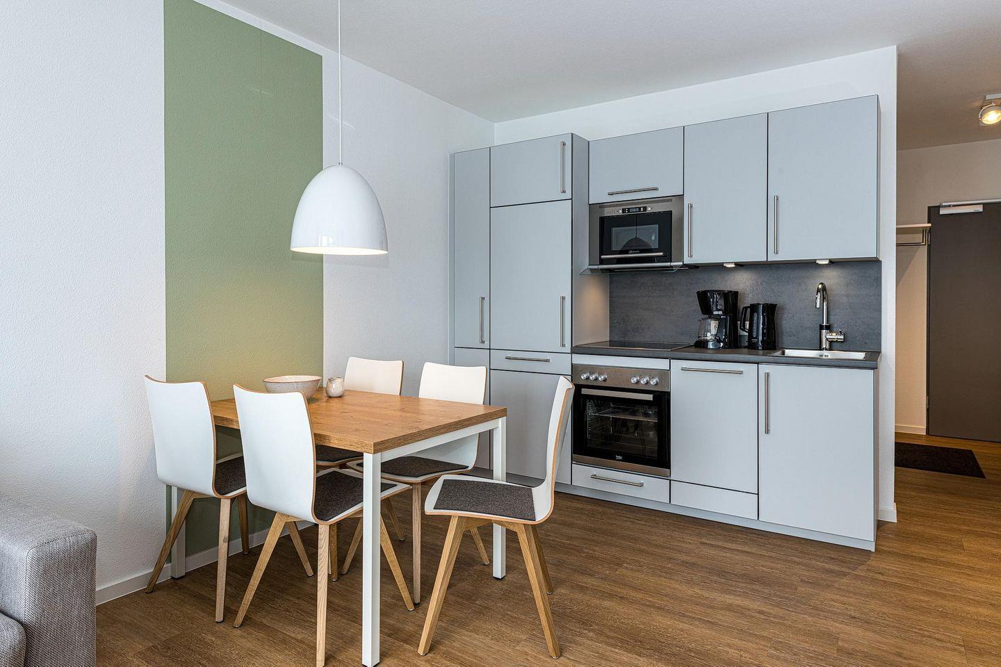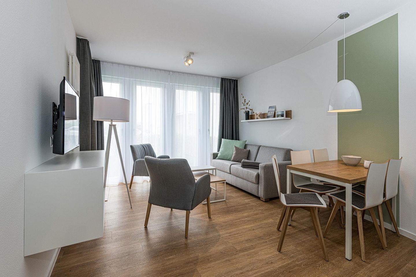 Das geschmackvoll eingerichtete Nichtraucher-Apartment verfügt über kostenfreies WLAN. Der Wohnbereich mit einer Schlafcouch bietet eine voll ausgestattete offene Küchenzeile mit Geschirrspüler, Gefrierfach, Kaffeemaschine, Toaster, Wasserkocher, Backofen und Mikrowelle sowie einen großen Flatscreen-TV und ein Radio. Das Apartment verfügt über einen Esstisch für 5 Personen und einen behaglichen Sitzbereich. Zwei separate Schlafzimmer stehen euch zur Verfügung. Eines davon verfügt über ein Doppelbett und einen eigenen Flatscreen-TV, ein weiteres über zwei Einzelbetten. Ein Kinderbett kann gegen Entgelt aufgestellt werden. Im stilvollen Badezimmer befinden sich eine große begehbare Dusche sowie ein Waschtisch mit Föhn und Kosmetikspiegel. Nach einem erlebnisreichen Urlaubstag entspannt ihr auf der überdachten und mit Gartenmöbeln für 5 Personen ausgestatteten Terrasse.