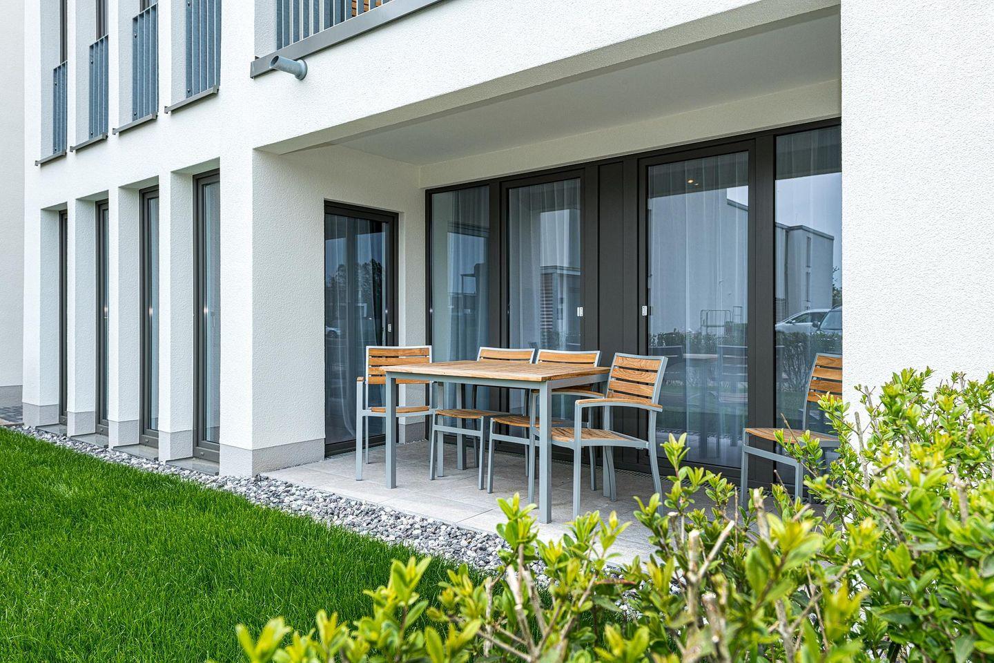 Die 62 m² große 3-Zimmer barrierefreie Ferienwohnung ist für bis zu 5 Personen geeignet. Besonders hervorzuheben ist die überdachte Terrasse in Süd-Ost-Lage. Hier lässt sich bereits beim Frühstück die Morgensonne genießen.