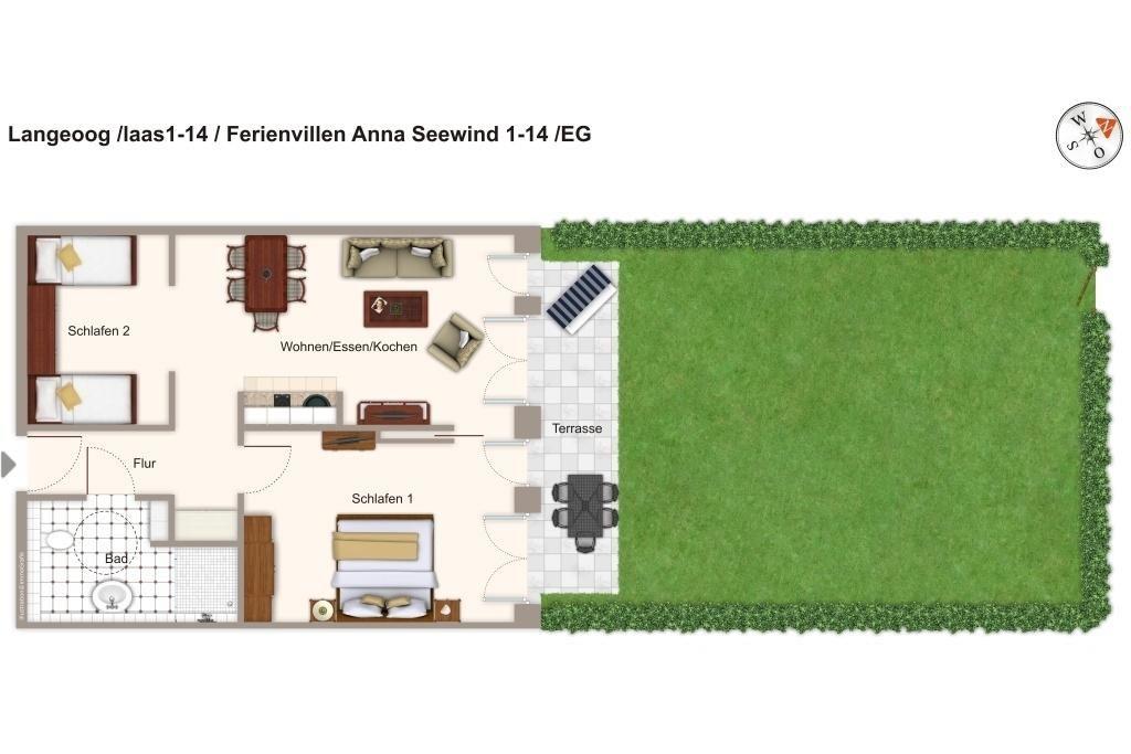 Das 73 m² große, barrierearme und rollstuhlfreundliche 3-Zimmer Apartment ist für bis zu 5 Personen geeignet. Besonders hervorzuheben ist die Terrasse in Ost-Lage mit einer großzügigen Grünfläche. Hier lässt es sich wunderbar entspannen und das besondere Inselfeeling Langeoogs genießen.