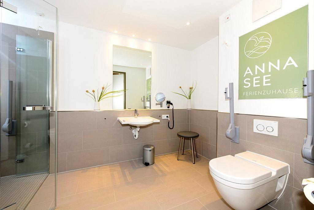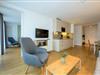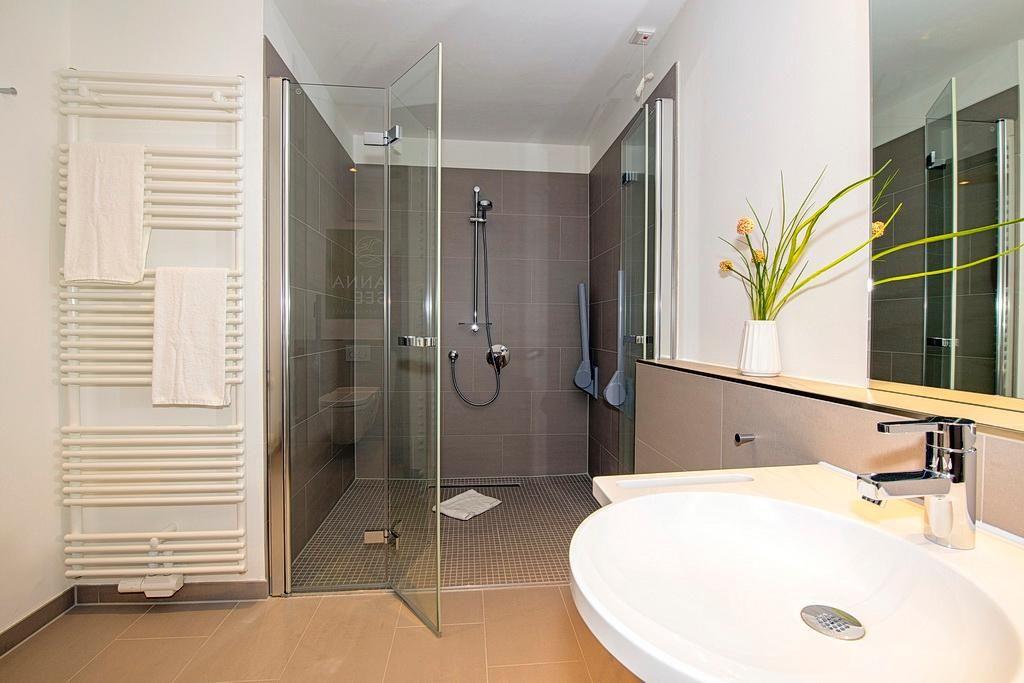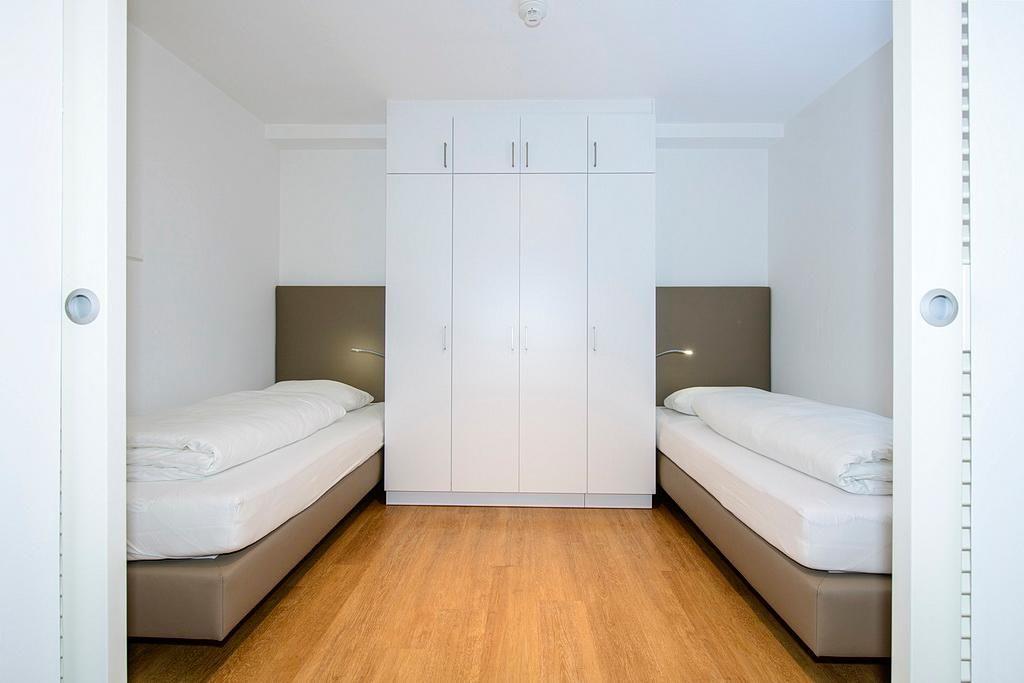 Das barrierearme Nichtraucher-Apartment verfügt über kostenfreies WLAN. Der Wohnbereich mit Schlafcouch bietet eine voll ausgestattete offene Küchenzeile mit Geschirrspüler, Gefrierfach, Kaffeemaschine, Toaster, Wasserkocher und Mikrowelle mit Grillfunktion sowie einen großen Flatscreen-TV und Radio. Das Apartment verfügt über einen Esstisch und einen behaglichen Sitzbereich. Im separaten Schlafzimmer befindet sich ein Doppelbett und ein zweiter Flatscreen-TV, in einem weiteren Schlafbereich mit Schiebetür stehen Ihnen zwei Einzelbetten zur Verfügung. Ein Kinderbett kann gegen Entgelt aufgestellt werden. Im stilvollen Badezimmer befinden sich eine große begehbare Dusche sowie ein Waschtisch mit Föhn und Kosmetikspiegel. Nach einem erholsamen Urlaubstag lässt es sich auf der mit Gartenmöbeln und Strandkorb ausgestatteten Terrasse herrlich entspannen.
