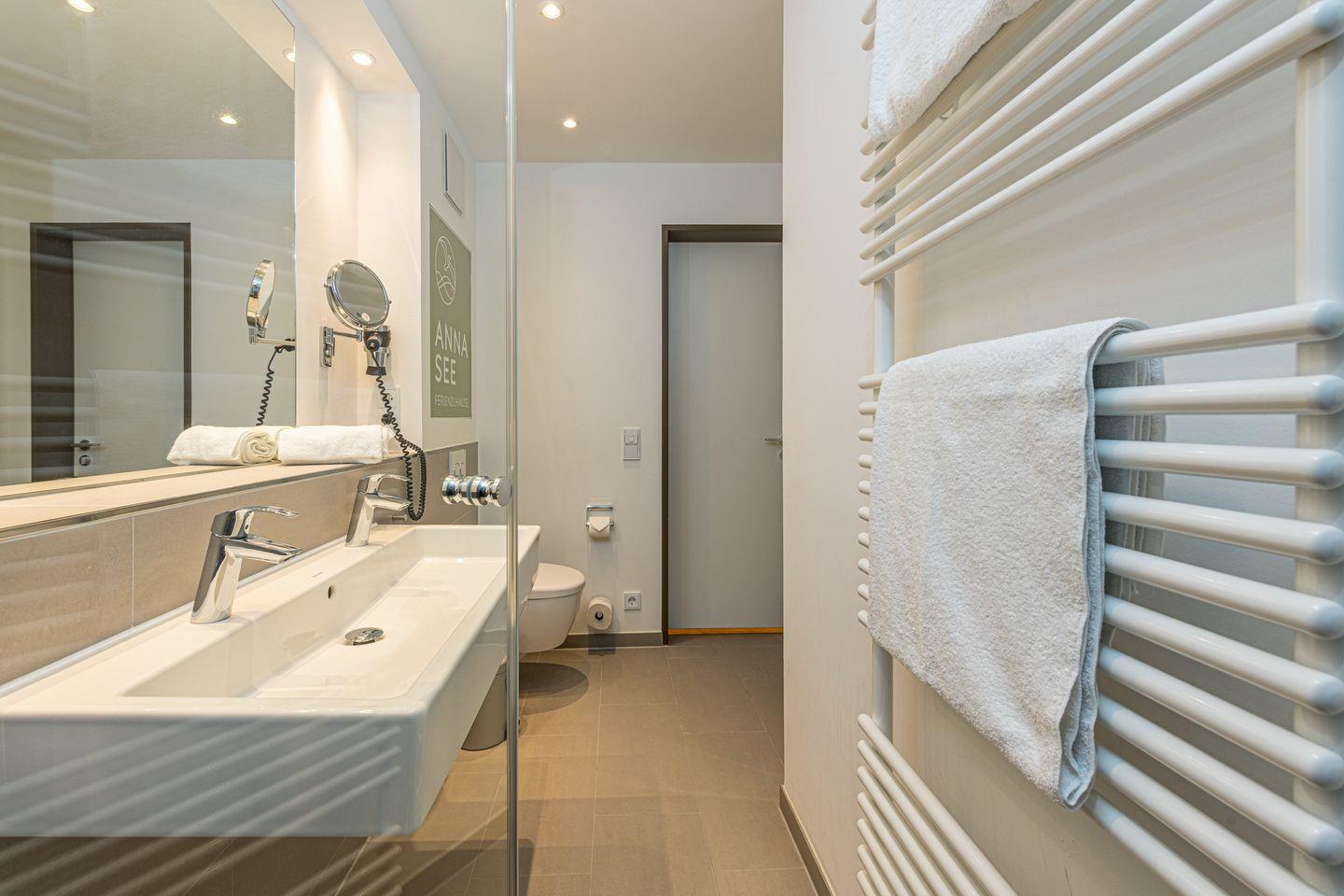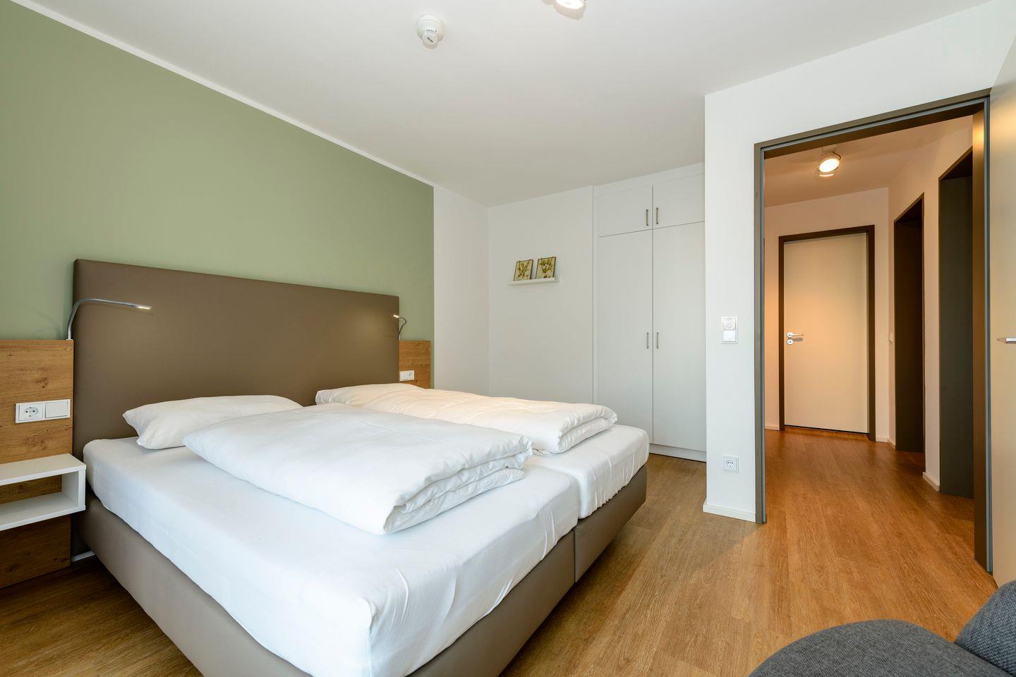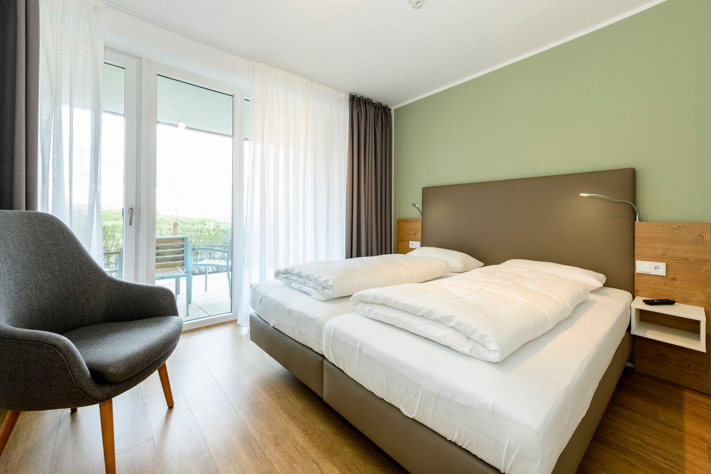 Das hochwertige Nichtraucher-Apartment verfügt über kostenfreies WLAN. Der Wohnbereich bietet eine voll ausgestattete offene Küche mit Geschirrspüler, Gefrierfach, Kaffeemaschine, Toaster, Wasserkocher und Mikrowelle mit Grillfunktion sowie einen großen Flatscreen-TV und Radio. Das Apartment verfügt über einen Esstisch für 7 Personen und einen behaglichen Sitzbereich. Drei separate Schlafzimmer stehen Ihnen zur Verfügung. Zwei Schlafzimmer verfügen über jeweils ein Doppelbett und Flatscreen-TV, ein Schlafzimmer besitzt einen eigenen Zugang zur Terrasse. Das dritte Alkoven-Schlafzimmer beinhaltet zwei Einzelbetten und einen Schlafsessel. Ein Kinderbett kann gegen Entgelt aufgestellt werden. In zwei stilvollen Badezimmern befinden sich eine große begehbare Dusche bzw. eine Badewanne sowie ein Waschtisch mit Föhn und Kosmetikspiegel. Auf der großen Terrasse könnt ihr in großer Runde gemütlich beisammensitzen und im Strandkorb entspannen.