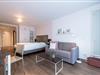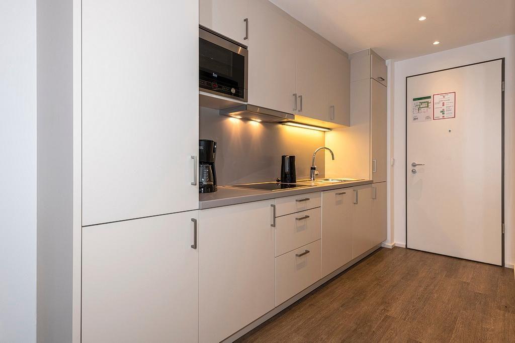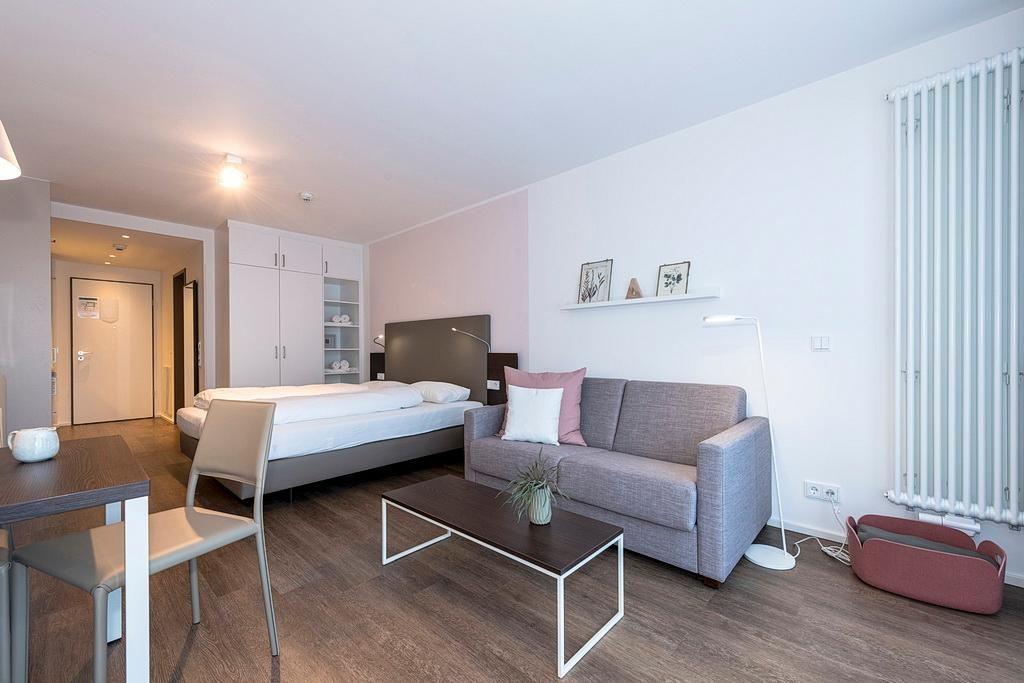 Das barrierearme Nichtraucher-Apartment verfügt über kostenfreies WLAN. Der Wohn- und Schlafraum bietet eine voll ausgestattete offene Küchenzeile mit Geschirrspüler, Gefrierfach, Kaffeemaschine, Toaster, Wasserkocher und Mikrowelle mit Grillfunktion sowie ein Doppelbett, Couch mit Schlaffunktion, einen großen Flatscreen-TV und Radio. Das Apartment verfügt über einen kleinen Esstisch und einen behaglichen Sitzbereich. Ein Kinderbett kann gegen Entgelt aufgestellt werden. Im stilvollen Badezimmer befinden sich eine große begehbare Dusche sowie ein Waschtisch mit Föhn und Kosmetikspiegel. Nach einem erholsamen Urlaubstag lässt es sich auf der mit Gartenmöbeln ausgestatteten Terrasse herrlich entspannen.