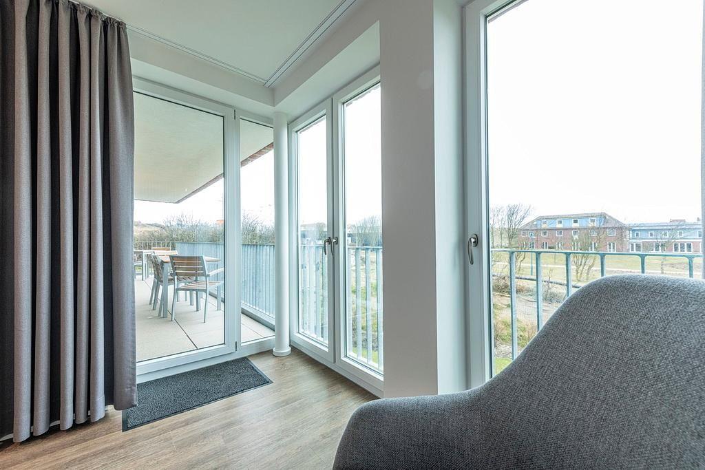 Das 98 m² große und barrierearmes 4-Zimmer Apartment ist für bis zu 6 Personen geeignet. Besonders hervorzuheben ist der überdachte Balkon, ähnlich einer Loggia, nach Nord-Ost gelegen. Hier genießt ihr den ganzen Tag das wohltuende Nordseeklima. Darüber hinaus verfügt das Apartment über zwei Bäder.