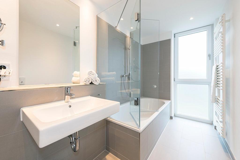 Das besonders hochwertige Nichtraucher-Apartment verfügt über kostenfreies WLAN. Der Wohnbereich bietet eine voll ausgestattete offene Küche mit Geschirrspüler, Gefrierfach, Kaffeemaschine, Toaster, Wasserkocher und Mikrowelle mit Grillfunktion sowie einen großen Flatscreen-TV und Radio. Das Apartment verfügt über einen Esstisch für 6 Personen und einen behaglichen Sitzbereich. Drei separate Schlafzimmer stehen Ihnen zur Verfügung. Eine Schlafzimmer verfügt über ein Flatscreen -TV, das Zweite über einen eigenen Zugang zum Balkon. Das dritte Schlafzimmer mit Etagenbett liegt direkt neben einem der Badezimmer. Ein Kinderbett kann gegen Entgelt aufgestellt werden. In den beiden stilvollen Badezimmern befinden sich eine große begehbare Dusche bzw. eine Badewanne sowie ein Waschtisch mit Föhn und Kosmetikspiegel. Auf dem tollen, großen Balkon könnt ihr in geselliger Runde gemütlich beisammensitzen.