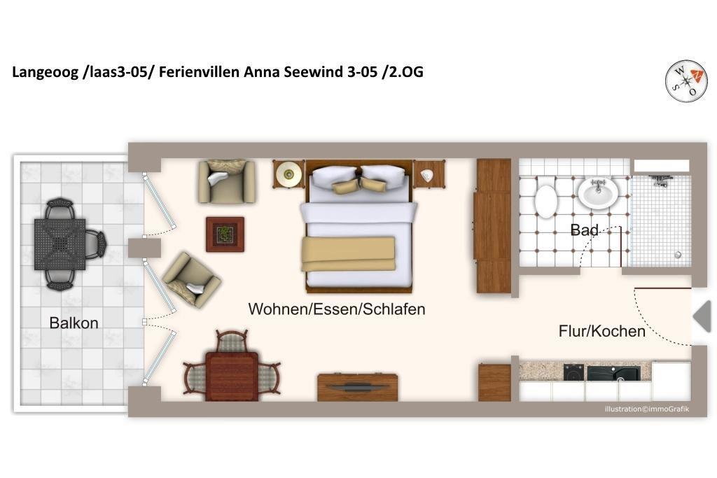 Die moderne und helle Ferienwohnung befindet sich in Süd-West-Lage im zweiten Obergeschoss der Apartmentvilla Anna See, im Langeooger Ortszentrum, an der Barkhausenstraße gelegen. Der weitläufige Sandstrand und die Promenade sind nur 300 Meter entfernt. In der unmittelbaren Umgebung findet ihr zahlreiche Einkaufsmöglichkeiten, Restaurants und Cafés sowie Freizeitangebote wie z.B. das beliebte Meerwasser-Erlebnisbad, den Golfclub und die Kitesurfschule.