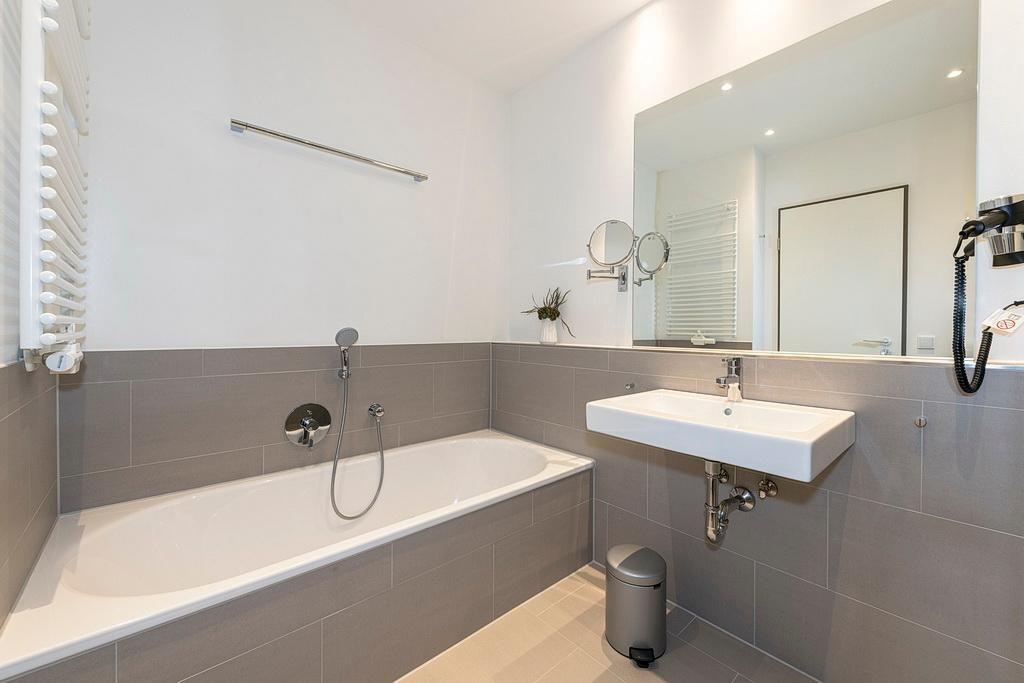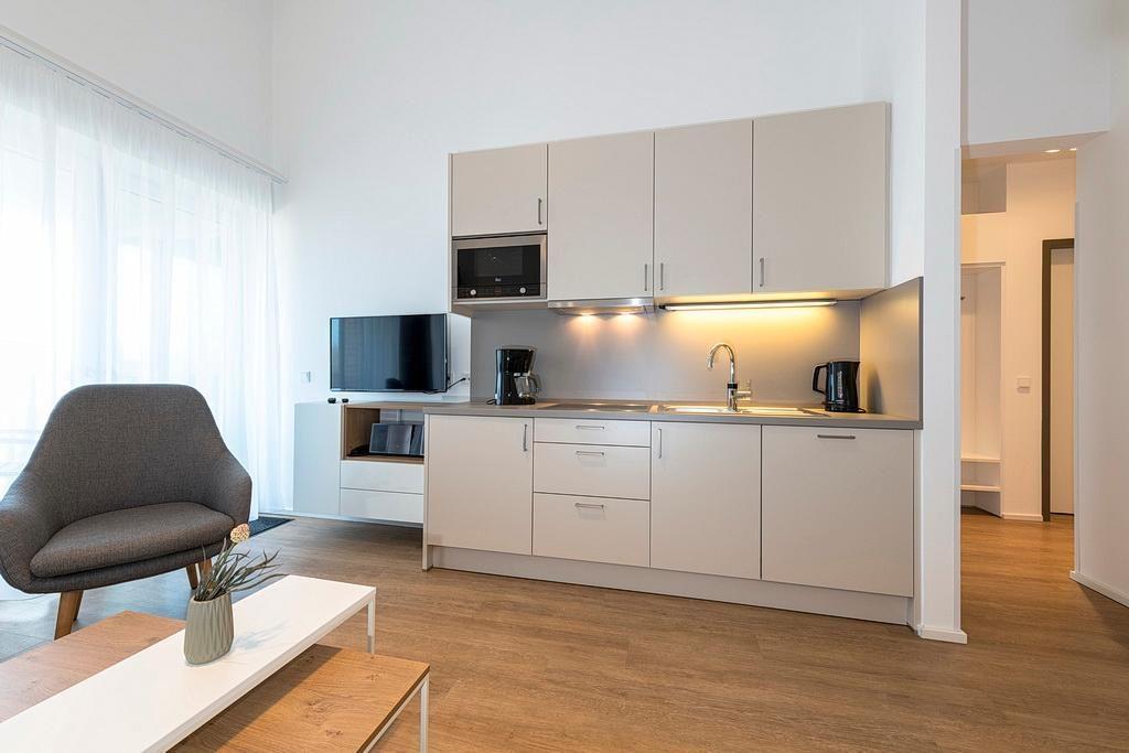 Das barrierearme Nichtraucher-Apartment verfügt über kostenfreies WLAN. Der Wohnbereich bietet eine voll ausgestattete offene Küchenzeile mit Geschirrspüler, Gefrierfach, Kaffeemaschine, Toaster, Wasserkocher und Mikrowelle mit Grillfunktion sowie einen großen Flatscreen-TV und Radio. Das Apartment verfügt über einen Esstisch und einen behaglichen Sitzbereich. Im separaten Schlafzimmer befindet sich ein Doppelbett und ein zweiter Flatscreen-TV, in einem weiteren Schlafbereich mit Schiebetür steht euch ebenfalls ein Doppelbett zur Verfügung. Ein Kinderbett kann gegen Entgelt aufgestellt werden. Im stilvollen Badezimmer befinden sich eine große begehbare Dusche, eine Badewanne sowie ein Waschtisch mit Föhn und Kosmetikspiegel. Nach einem erholsamen Urlaubstag lässt es sich auf der geschützten Loggia herrlich entspannen.