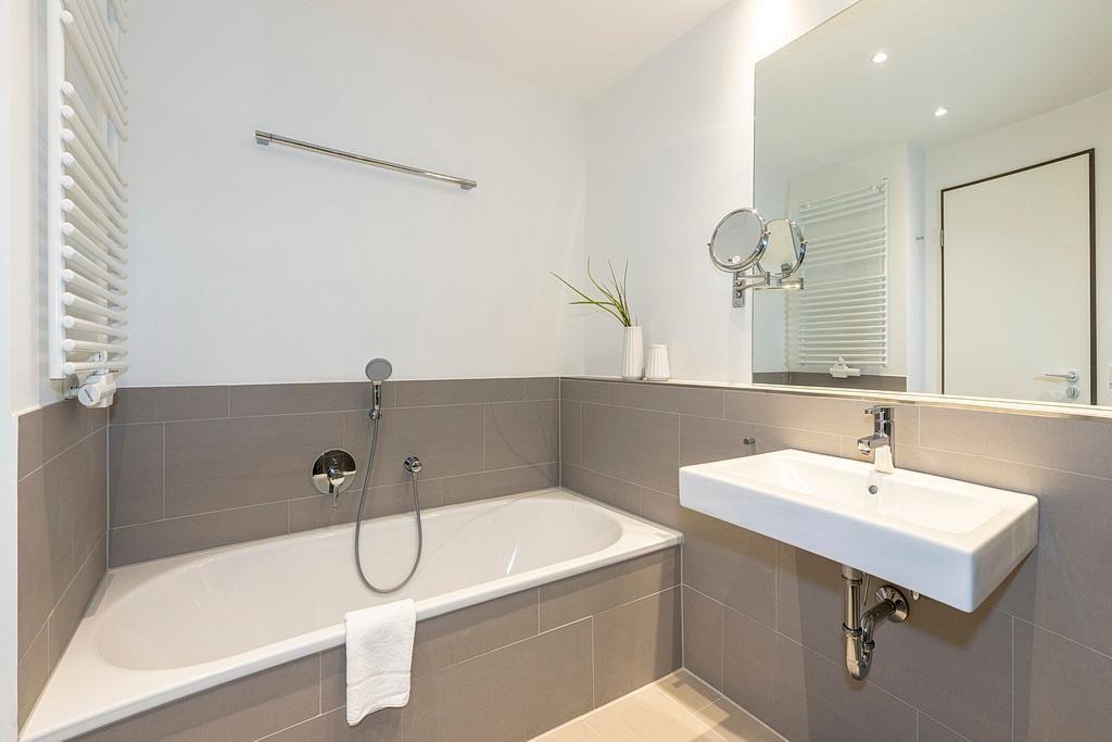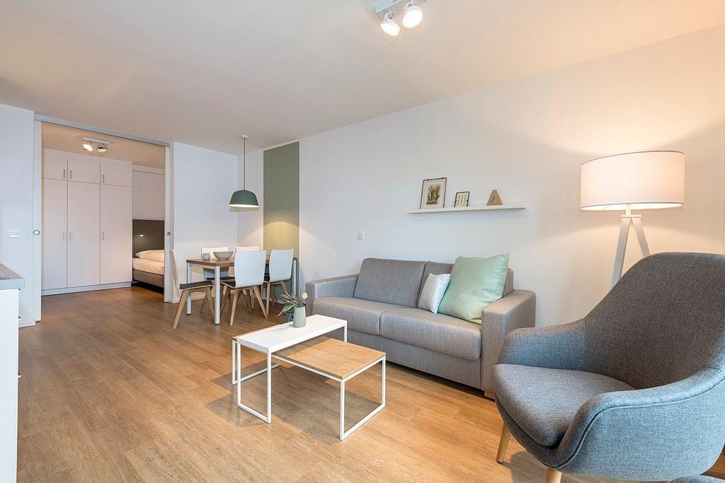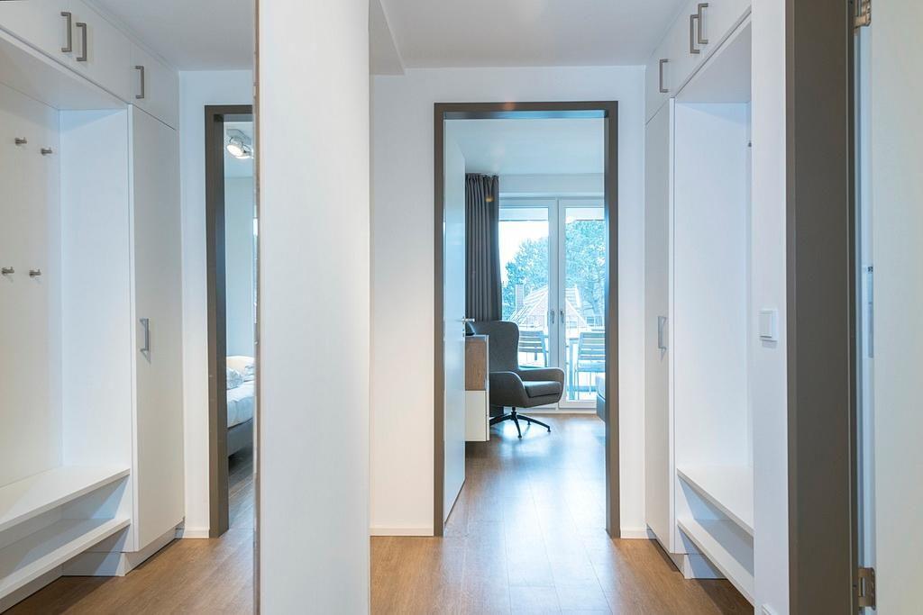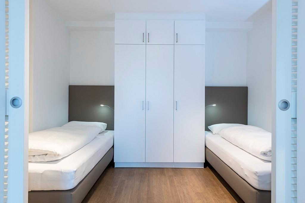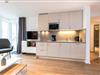 Das barrierearme Nichtraucher-Apartment verfügt über kostenfreies WLAN. Der Wohnbereich, mit einer Schlafcouch, bietet eine voll ausgestattete offene Küchenzeile mit Geschirrspüler, Gefrierfach, Kaffeemaschine, Toaster, Wasserkocher und Mikrowelle mit Grillfunktion sowie einen großen Flatscreen-TV und Radio. Das Apartment verfügt über einen Esstisch und einen behaglichen Sitzbereich. Im separaten Schlafzimmer befindet sich ein Doppelbett und ein zweiter Flatscreen-TV, in einem weiteren Schlafbereich mit Schiebetür stehen euch zwei Einzelbetten zur Verfügung. Ein Kinderbett kann gegen Entgelt aufgestellt werden. Im stilvollen Badezimmer befinden sich eine große begehbare Dusche, eine Badewanne sowie ein Waschtisch mit Föhn und Kosmetikspiegel. Nach einem erholsamen Urlaubstag lässt es sich auf dem sonnigen und geschützten Balkon herrlich entspannen.