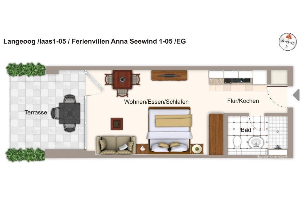 Das 33 m² große 1-Zimmer Apartment ist für bis zu 3 Personen geeignet. Besonders hervorzuheben ist die Terrasse in sonnenreicher Westlage. Hier können Sie sonnige und erholsame Urlaubstage und laue Sommerabende verleben.