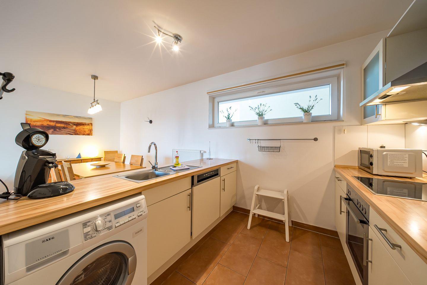Die gehobene Ausstattung besteht zudem aus einer voll ausgestatteten offenen Küche mit Backofen, Geschirrspüler, Tiefkühlfach, Wasserkocher, Kapselkaffeemaschine (Philips Senseo), Toaster, aus Bügeleisen und Bügelbrett, Waschmaschine und TV-HiFi-Anlage mit 2 TV-Geräten, DVD-Player und DVDs, Gesellschaftsspielen, Büchern.