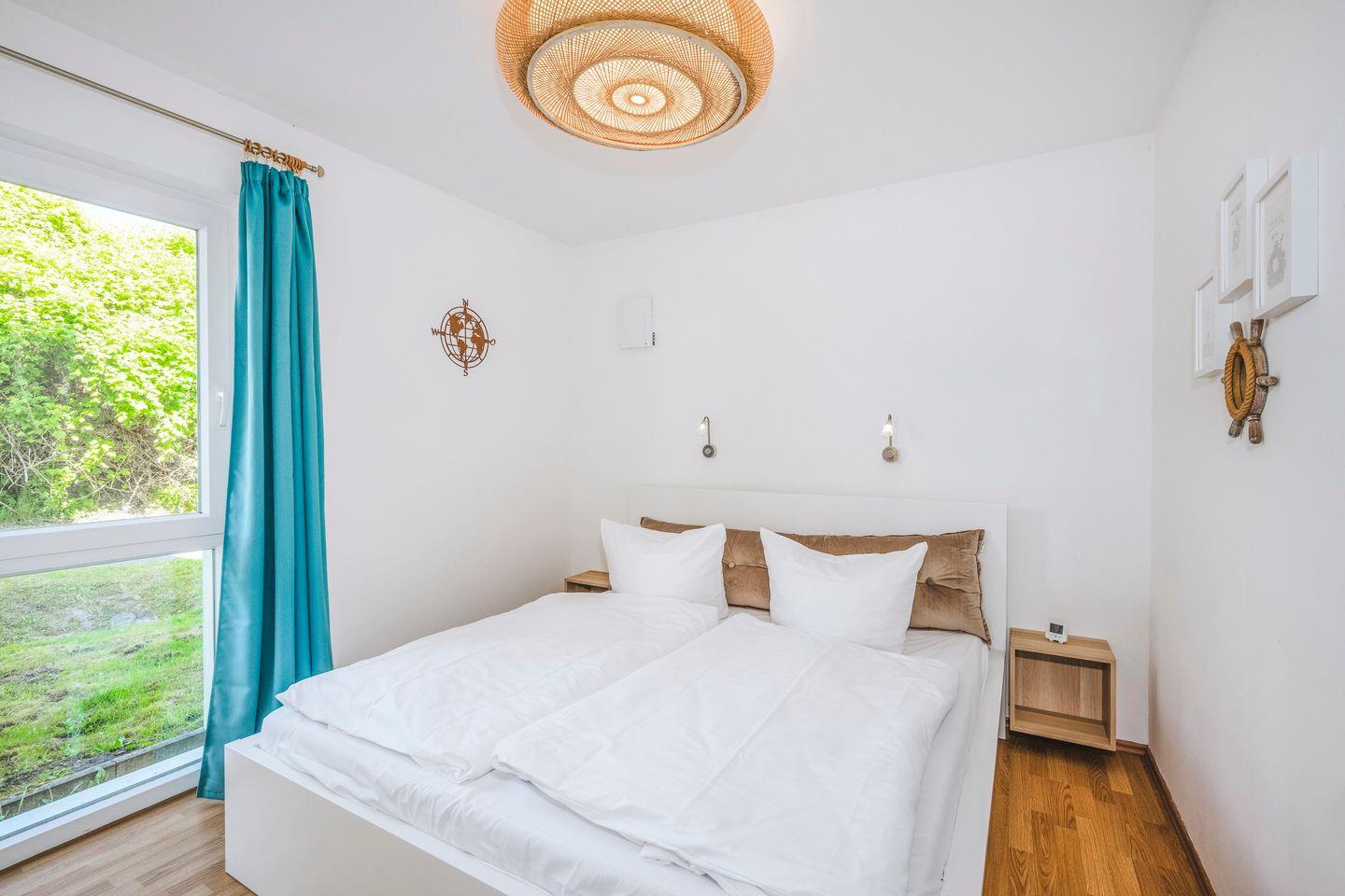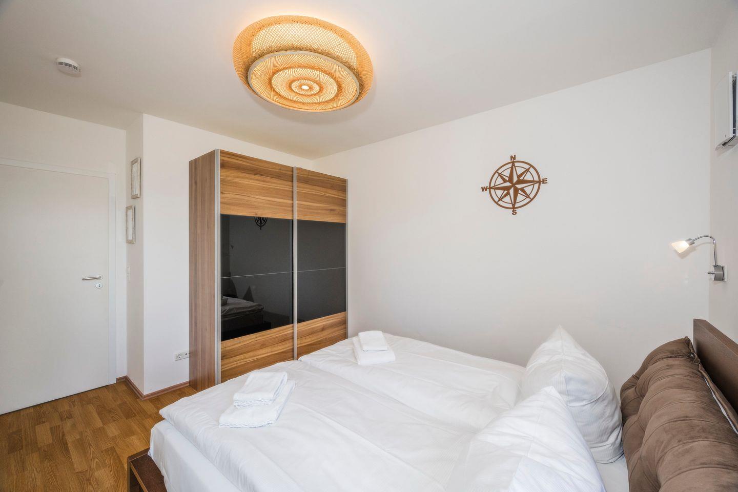 Zum Apartment gehören zwei Schlafzimmer mit jeweils einem Doppelbett (1,80 x 2,00 m und 1,60 x 2,00 m), ein geschmackvoll eingerichteter Wohnbereich mit Schlafcouch (1,60 x 2,00 m), ein hochwertiges Bad mit Dusche, Belüftungsanlage, Sauna, Waschmaschine, Trockner und Fußbodenheizung im Badezimmer und eine gemütliche Terrasse.