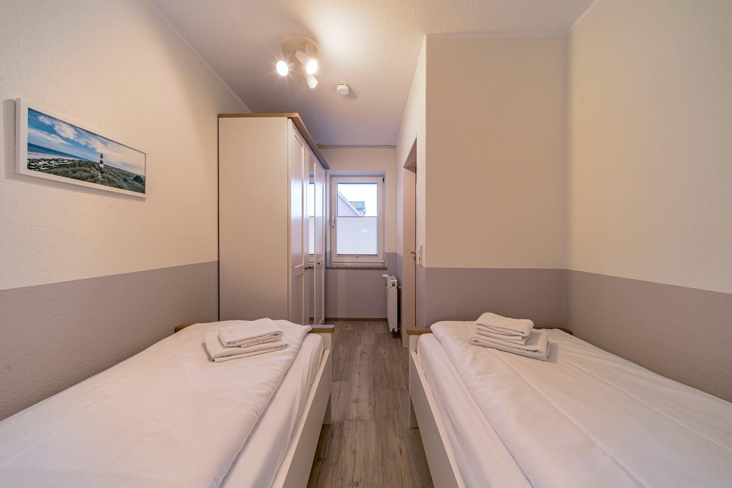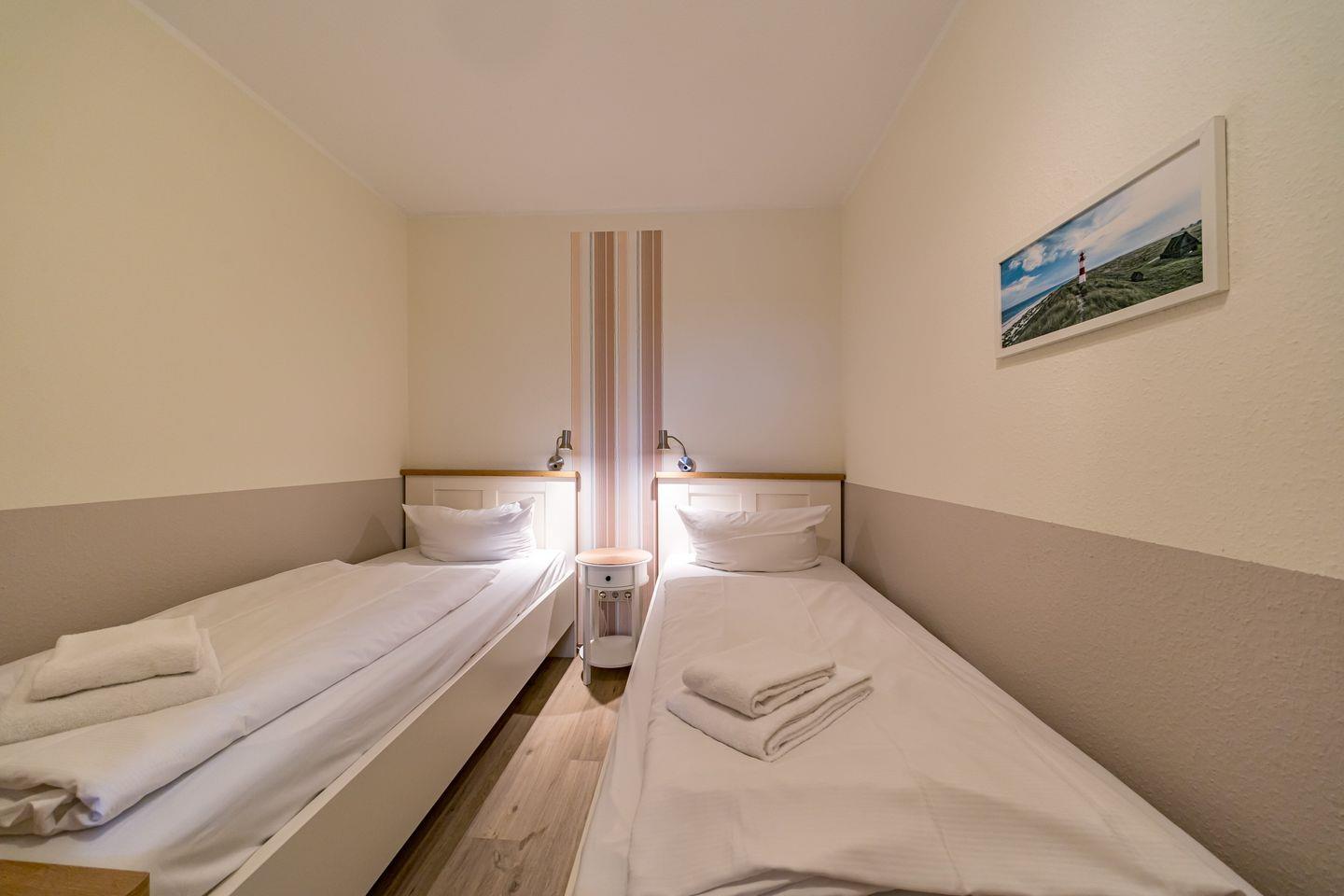 Ein Schlafzimmer mit 2 Einzelbetten, ein Wohnbereich mit Doppelschlafcouch und der Balkon mit westlichem Landblick auf Schillig ergeben die Konzeption des Apartments.
