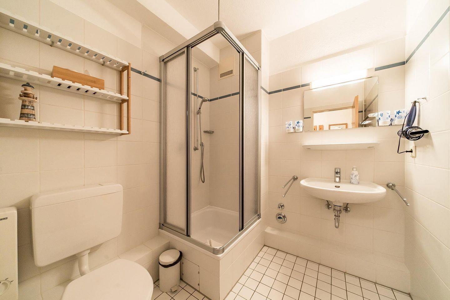 Eine voll ausgestattete offene Küche mit Geschirrspüler, Mikrowelle, Umluft-Einbauherd mit Ceranfeld, Wasserkocher, Kaffeemaschine, Toaster und ein Flachbild-TV, ein DVD -Player, eine HiFi-Anlage sowie Bücher und Gesellschaftsspiele komplettieren die Ausstattung des Feriendomizils an der Nordsee.
