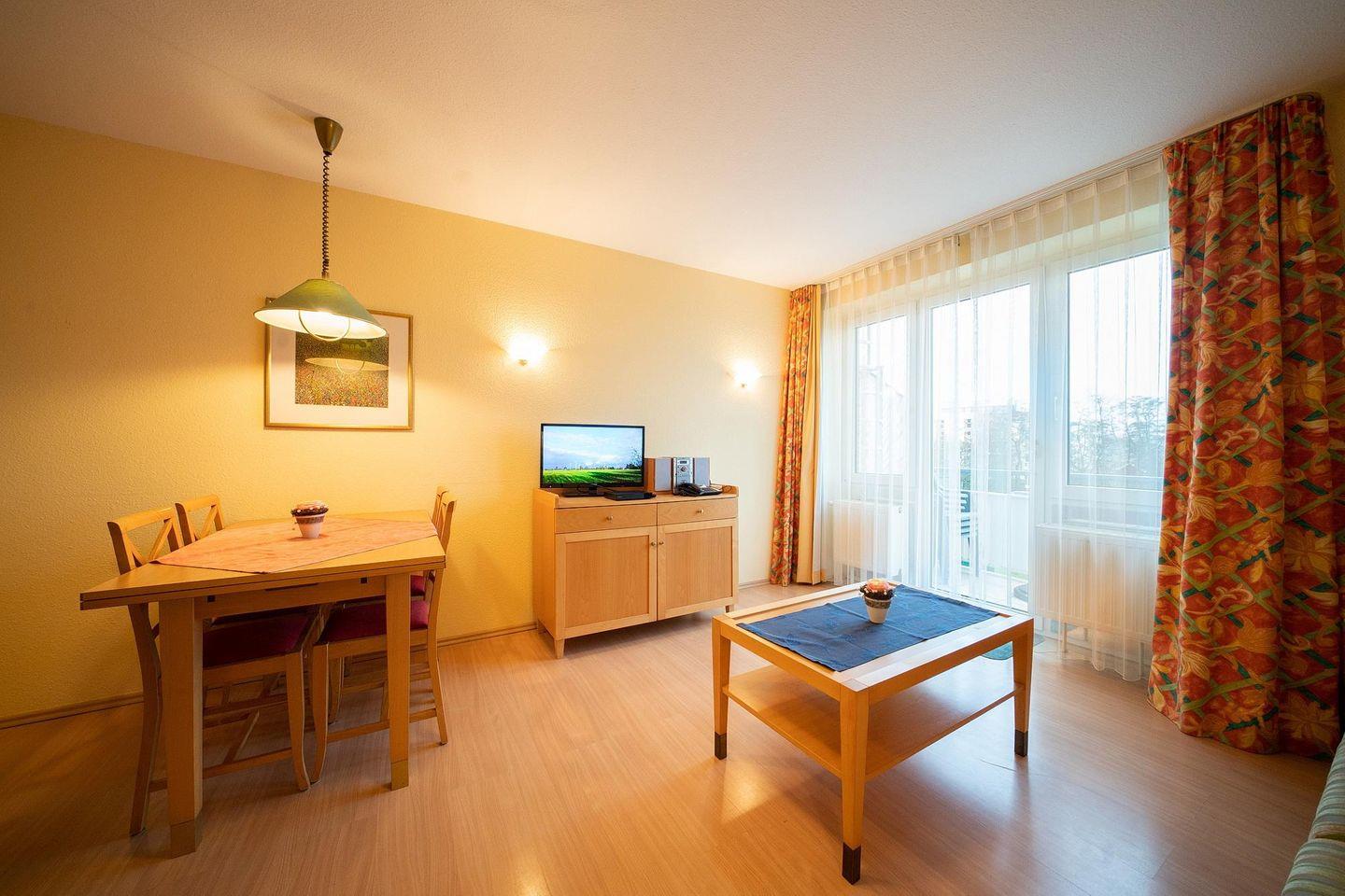 Die angrenzende abgetrennte Küche bietet Mikrowelle, Backofen, Kaffeefilter- und Kaffeepadmaschine, Toaster, Handstaubsauer, Mixer, Eier- und Wasserkocher und einen Kühlschrank mit Gefrierfach. Überdies verfügt das Apartment über Bügeleisen/-brett und Wäscheständer. Im Badezimmer mit WC und Dusche befindet sich ein Waschbecken mit Kindertritt sowie ein Föhn. Nach einem erlebnisreichen Urlaubstag lässt es sich auf dem mit Gartenmöbeln für vier Personen und Sonnenschirm ausgestatteten Balkon entspannen. Der Balkon ist vom Wohn-/ Essbereich zugänglich.