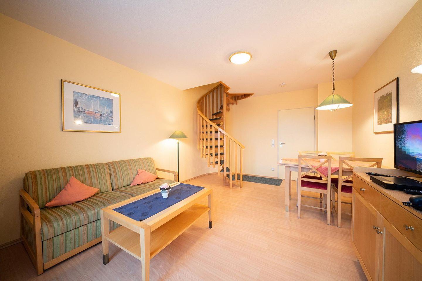 Das familienfreundliche Apartment heißt Kinder und Hunde gleichermaßen willkommen. Die Treppe der Maisonettewohnung ist durch ein Gitter am oberen Ende geschützt. Die Wohnung verfügt über eine separate Küche, einen kombinierten Ess-Wohnbereich mit Doppelschlafcouch sowie zwei separate Schlafzimmer, jeweils mit Doppelbett (Größe 180 x 200 cm). Eines der beiden Schlafzimmer besitzt überdies einen Flatscreen-TV. Ein Kinderreisebett und ein Kinderhochstuhl sind in der Wohnung vorhanden.