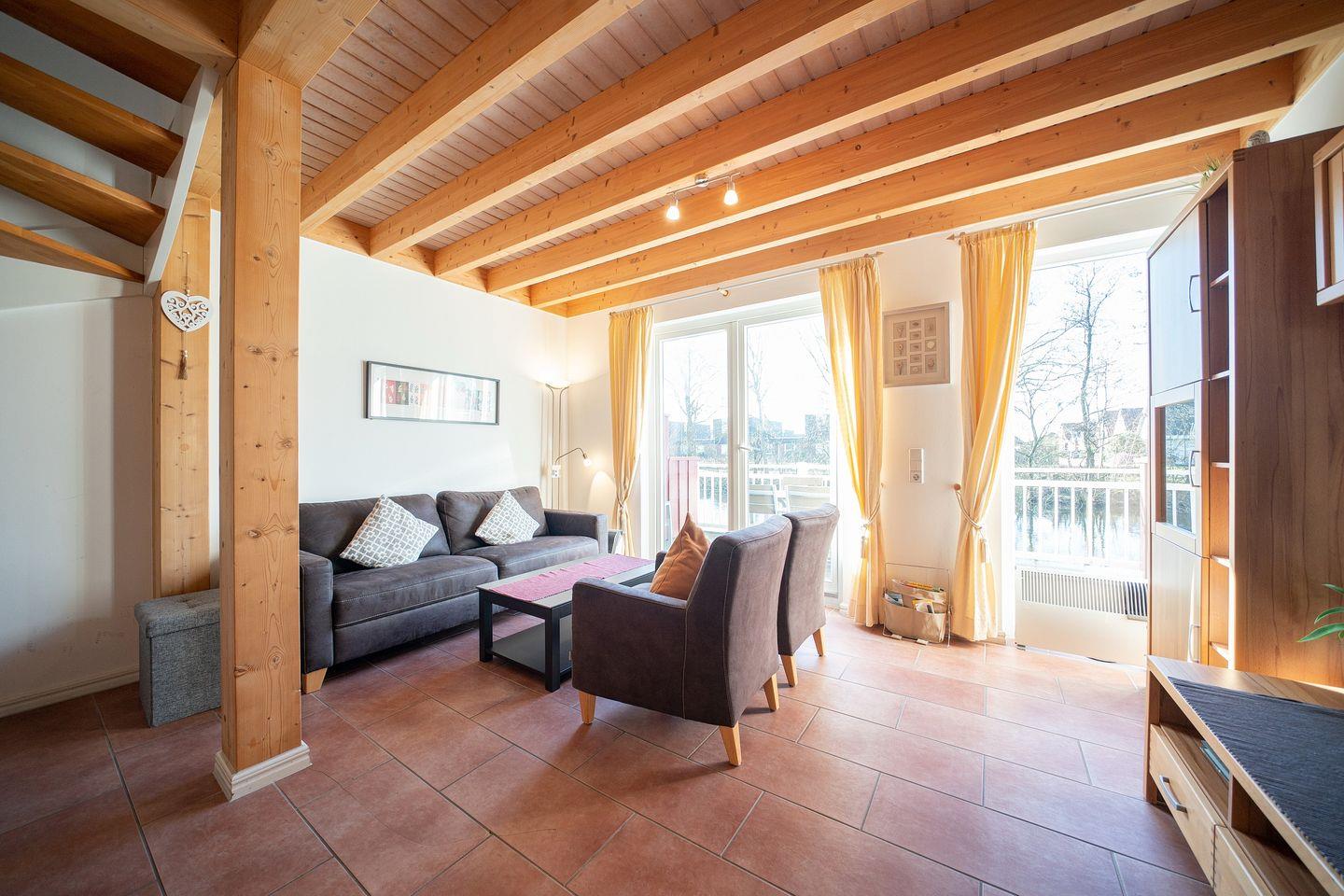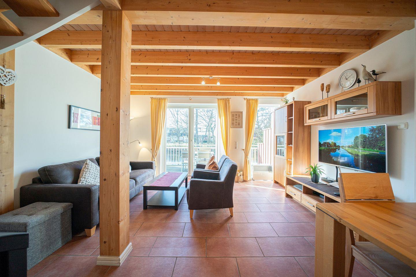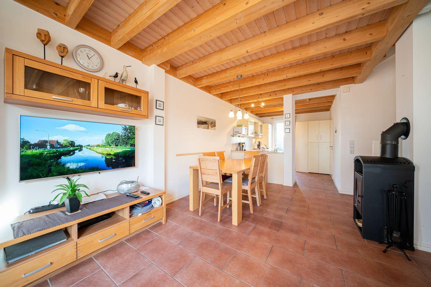 Euer Feriendomizil verfügt über kostenfreies WLAN und eine voll ausgestattet offene Küche mit Ceranherd und Backofen, Geschirrspüler, Mikrowelle, Kaffeemaschine, Toaster, Wasserkocher und Kühlschrank mit Tiefkühlfach. Der angeschlossene, überaus behagliche Wohn-Essbereich beinhaltet einen Kaminofen (Kaminholz ist nicht inbegriffen), einen großen Flatscreen-TV, Radio, CD- und DVD-Player und Bücher. Von hier aus habt ihr Zugang zur idyllischen Terrasse, direkt an der Graft gelegen.