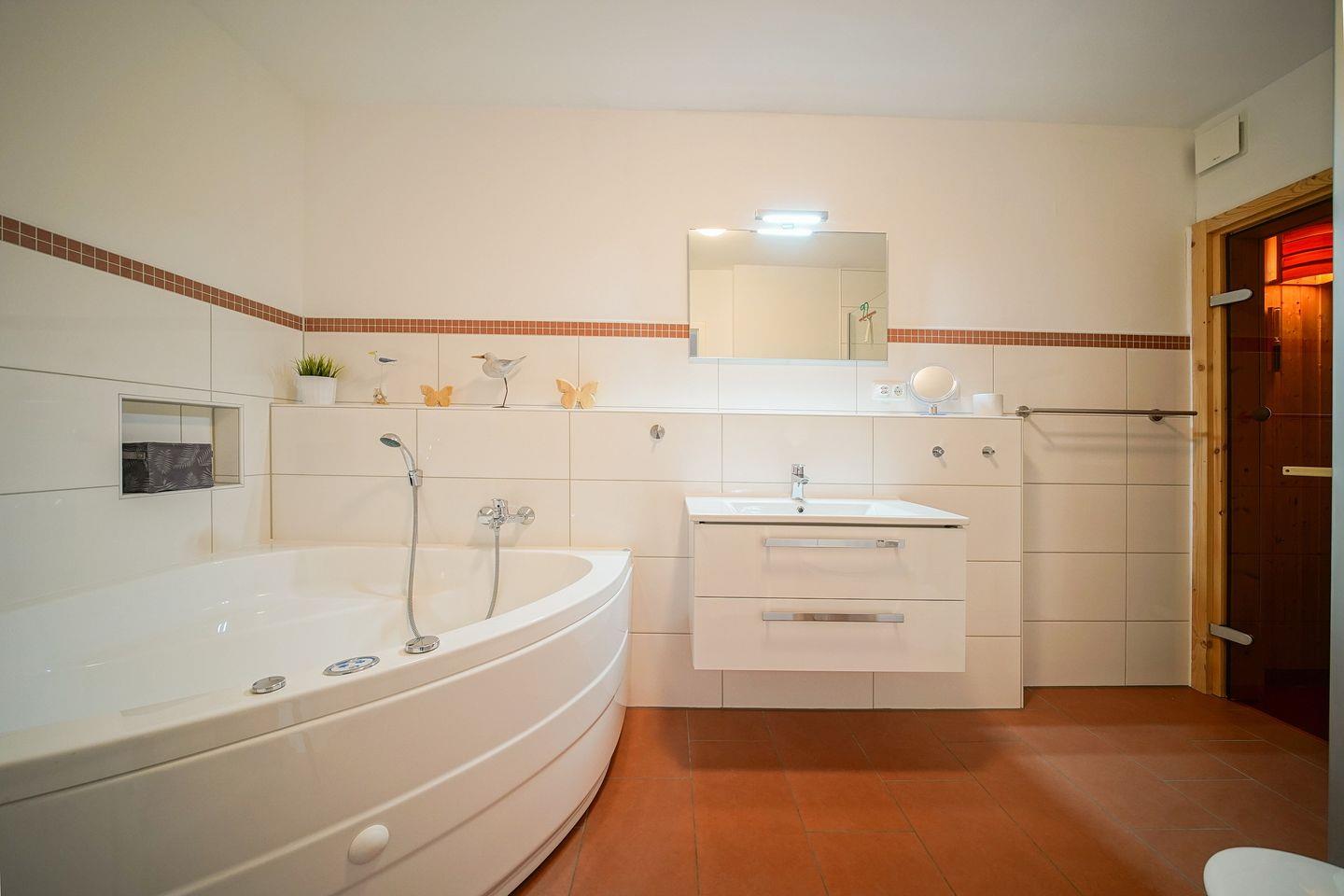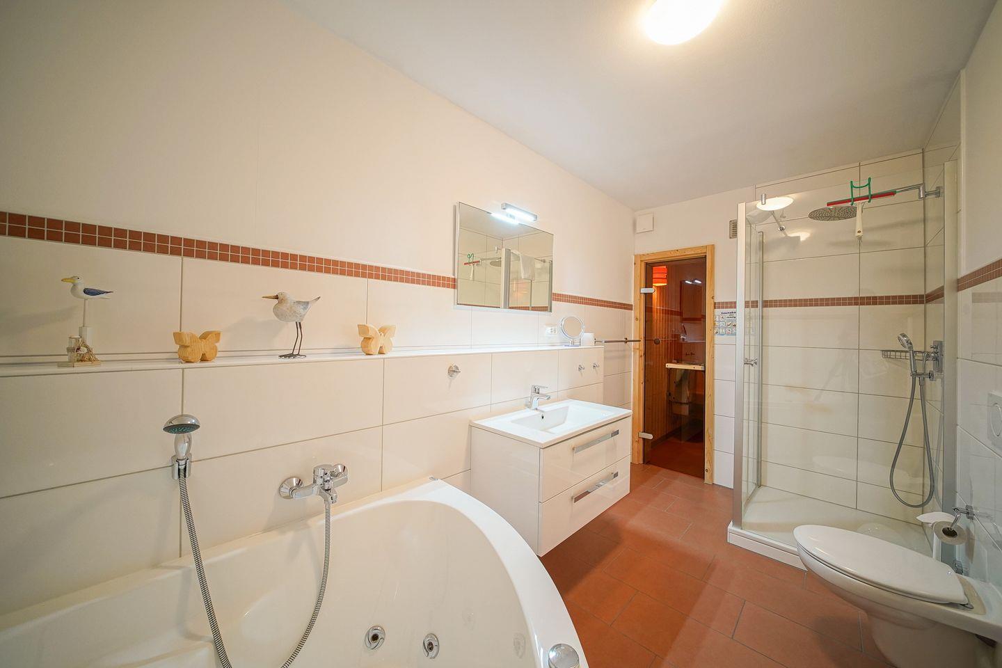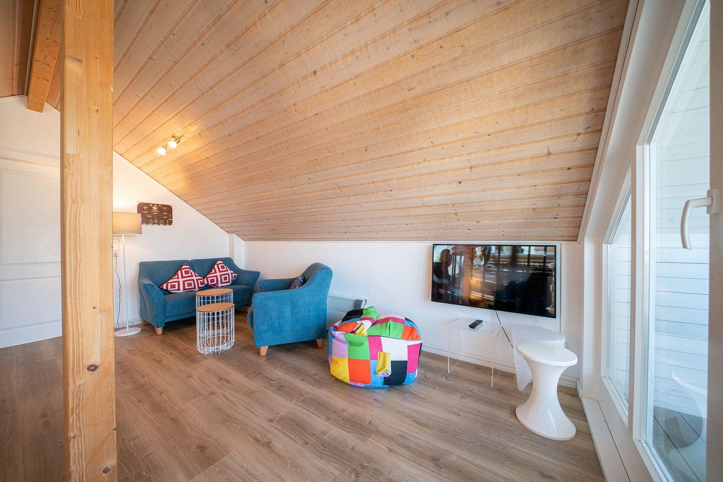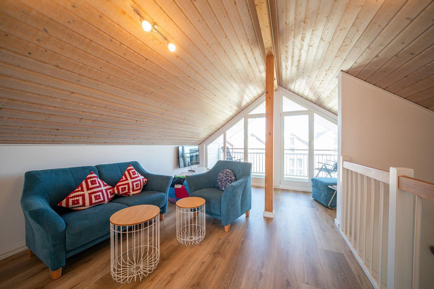 Das Nichtraucherferienhaus verfügt über zwei Schlafzimmer mit jeweils einem Doppelbett und über ein Schlafzimmer mit zwei Einzelbetten. Das großzügige Badezimmer gleicht einer kleinen, privaten Wellnessoase und bietet euch Sauna, Whirlbadewanne, Regendusche, Waschtisch und WC. Im Obergeschoss des Hauses befindet sich eine Galerie mit Sitzgruppe und Flatscreen-TV. Von hier aus habt ihr Zugang zum überdachten Balkon und könnt bis zum Meer sehen!
