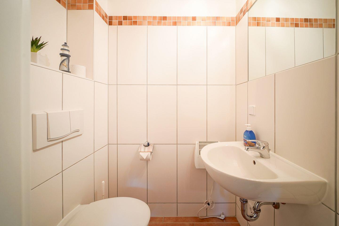 Ein separates Gäste-WC ist vorhanden. Das Ferienhaus verfügt des Weiteren über eine Waschmaschine und einen Kinderhochstuhl.