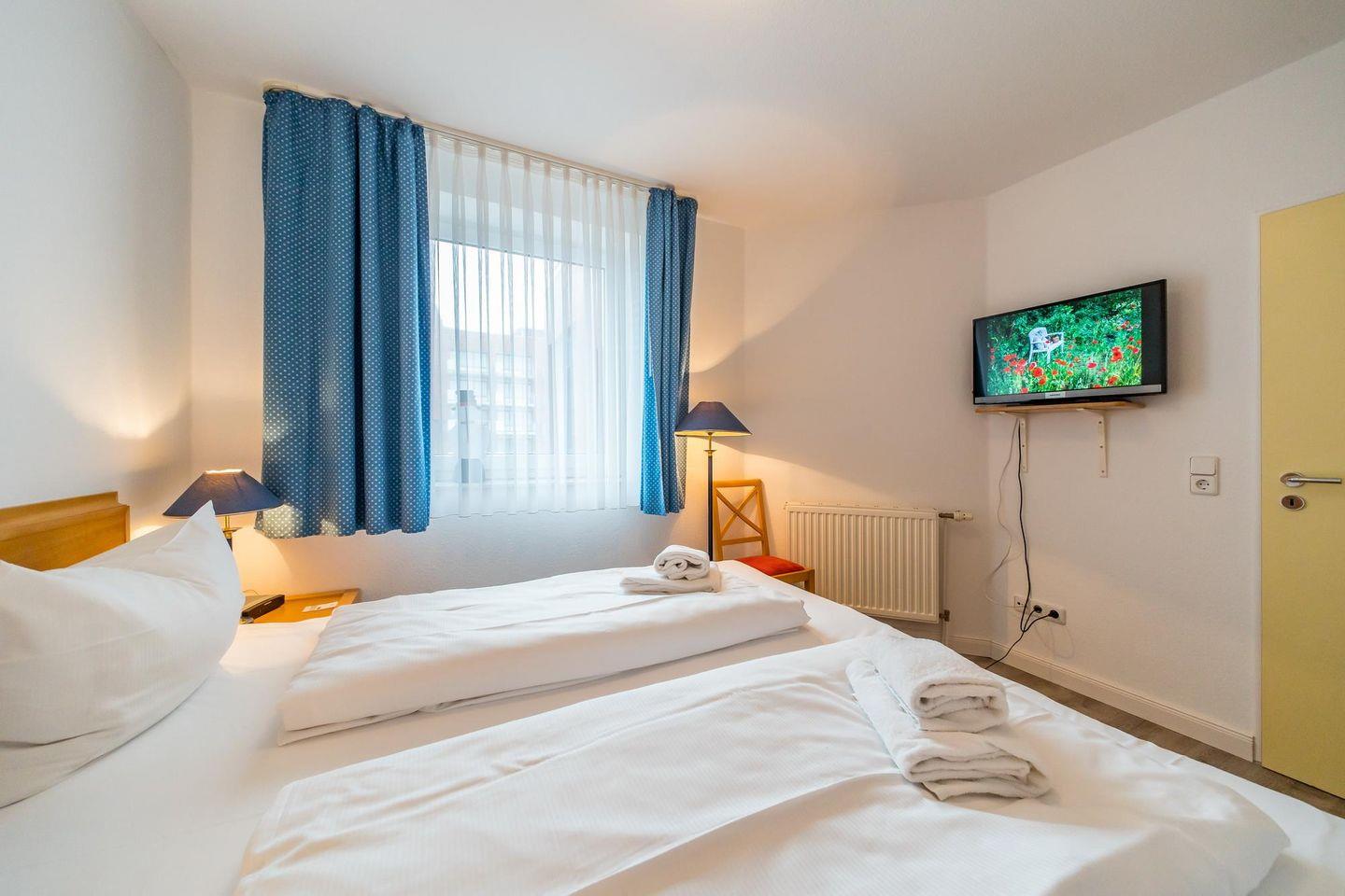 Zwei separate Schlafzimmer stehen euch zur Verfügung. Das Hauptschlafzimmer verfügt über ein Doppelbett (1,80 x 2,10 m) mit Flatscreen-TV (32 Zoll), das zweite Schlafzimmer verfügt über ein Einzelbett (0,90 x 2,10 m) und ist ebenfalls mit einem Flatscreen-TV ausgestattet (24 Zoll). Ein Kinderbett kann gegen Entgelt aufgestellt werden und auf Wunsch könnt ihr einen Hochstuhl hinzubuchen. Im Badezimmer befinden sich Dusche, WC, Föhn und Kosmetikspiegel.